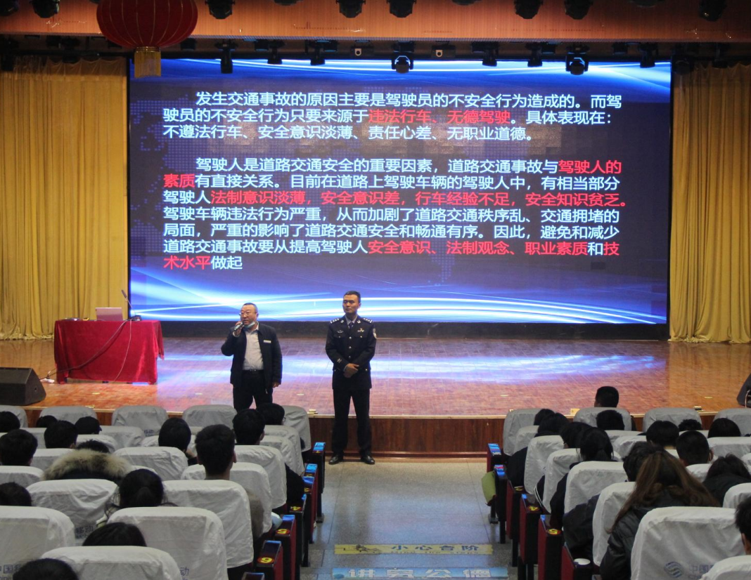 为切实做好校园交通安全防范,加强学生交通安全教育,预防交通事故对学生造成伤害,2021年11月30日,信息工程分院联合石河子交通警察支队在综合楼四楼阶梯教室开展了以“细节关乎生命 安全文明出行”的交通安全教育活动。学院保卫处处长杨春、保卫处卢彬老师,信息工程分院书记马晓燕、综合办李德良老师出席活动。