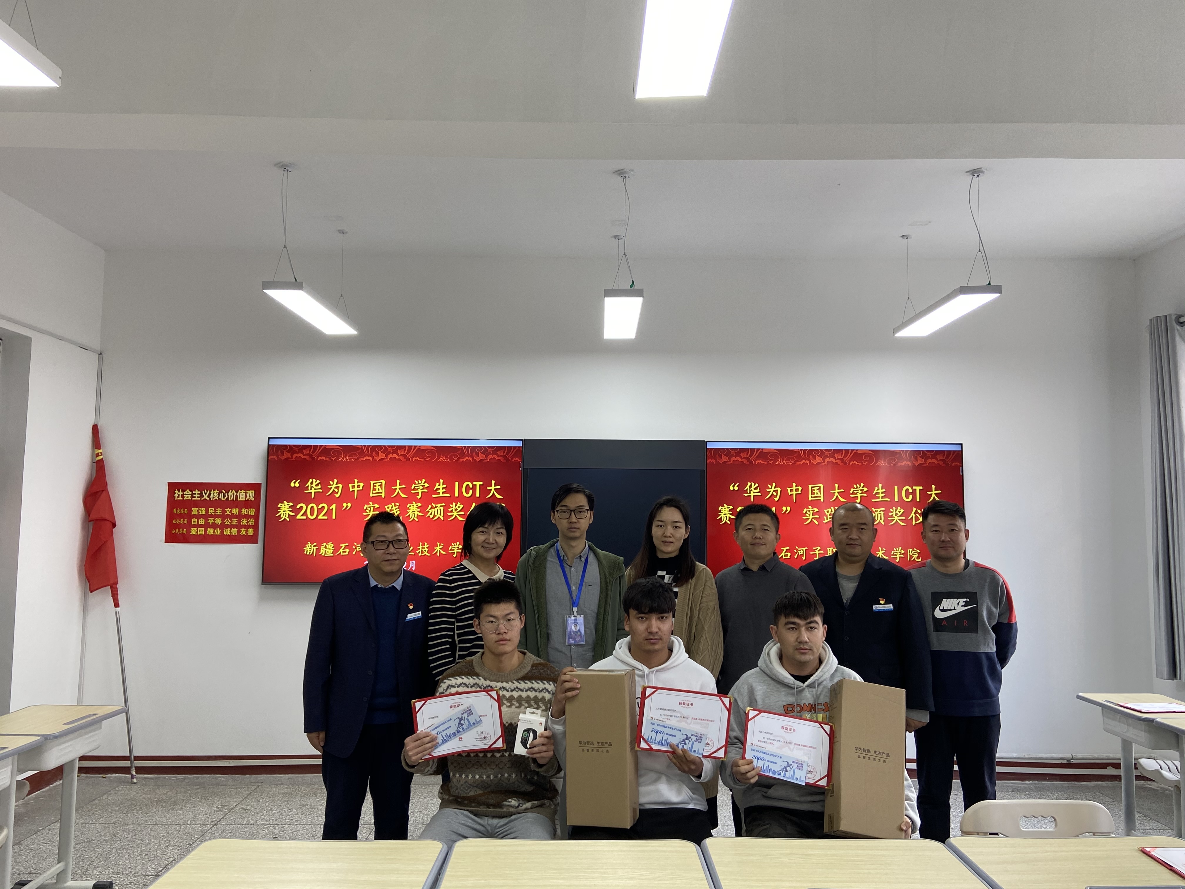 近日,“华为中国大学生ICT大赛2021”及“2021全国电子实用技术职业技能竞赛”圆满落幕,信息工程分院教师及学生团队在比赛项目中竞技强劲,表现突出。12月3日,信息工程分院在信息楼303教室为获奖师生举行了颁奖仪式。