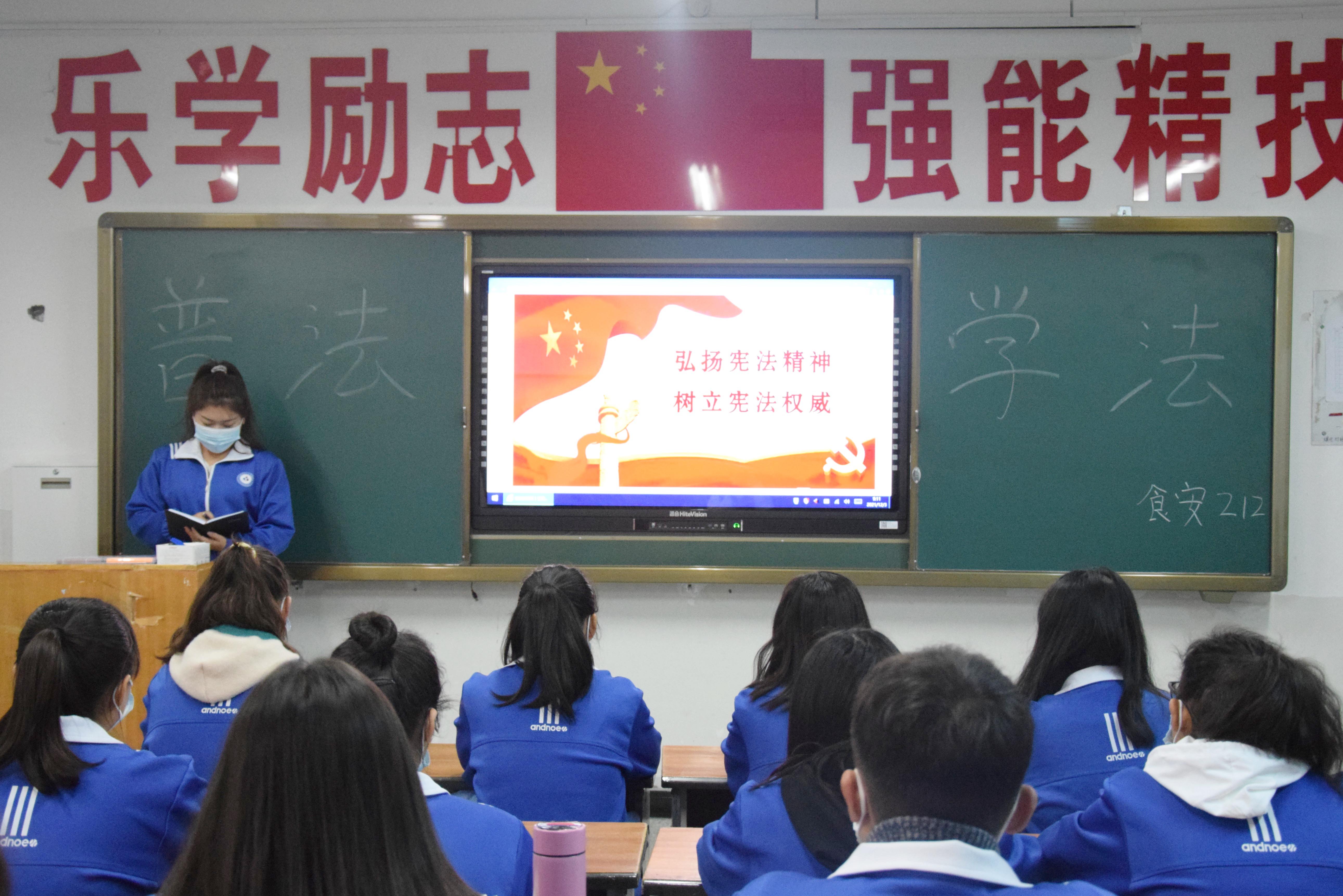 12月1日晚自习,分院以班级为单位开展了“学宪法 讲宪法”主题班会,加强各位同学对宪法的掌握,以及如何用宪法保护自身权益。班级负责人认真筹备整理材料,通过PPT展示宪法是如何维护公民的安全及利益。12月2日分院组织了以宪法日为主题的座谈会,各班代表40余人参加座谈,同学们兴趣高涨,积极讨论,将宪法和生活中的实际相结合,切实维护自身合法权益。12月3日上午9:00,教育部监制的全国青少年普法网网络直播准时开始,分院组织十八个在校班共计700余人利用班级多媒体共同观看,增加同学们对宪法的了解。