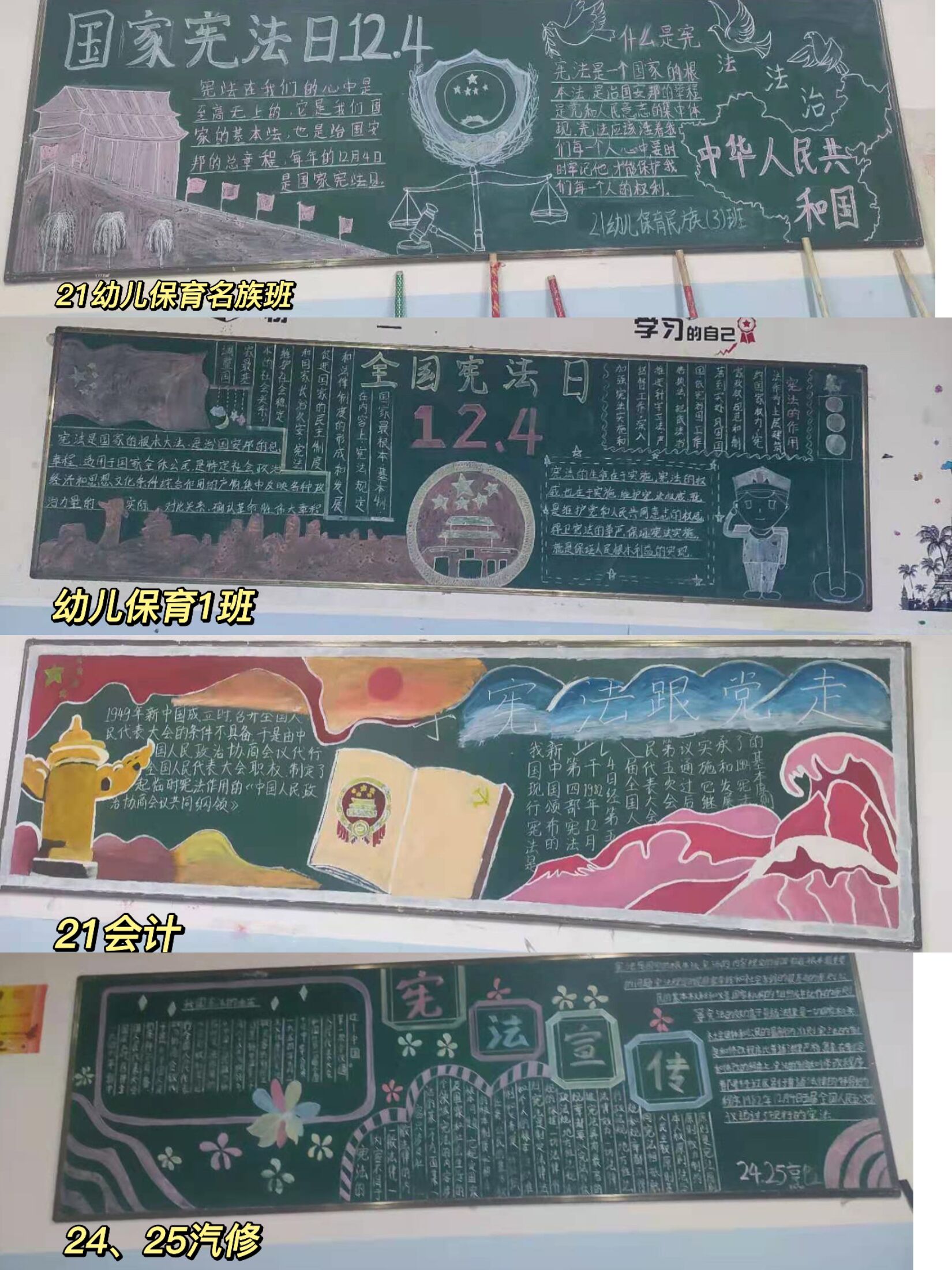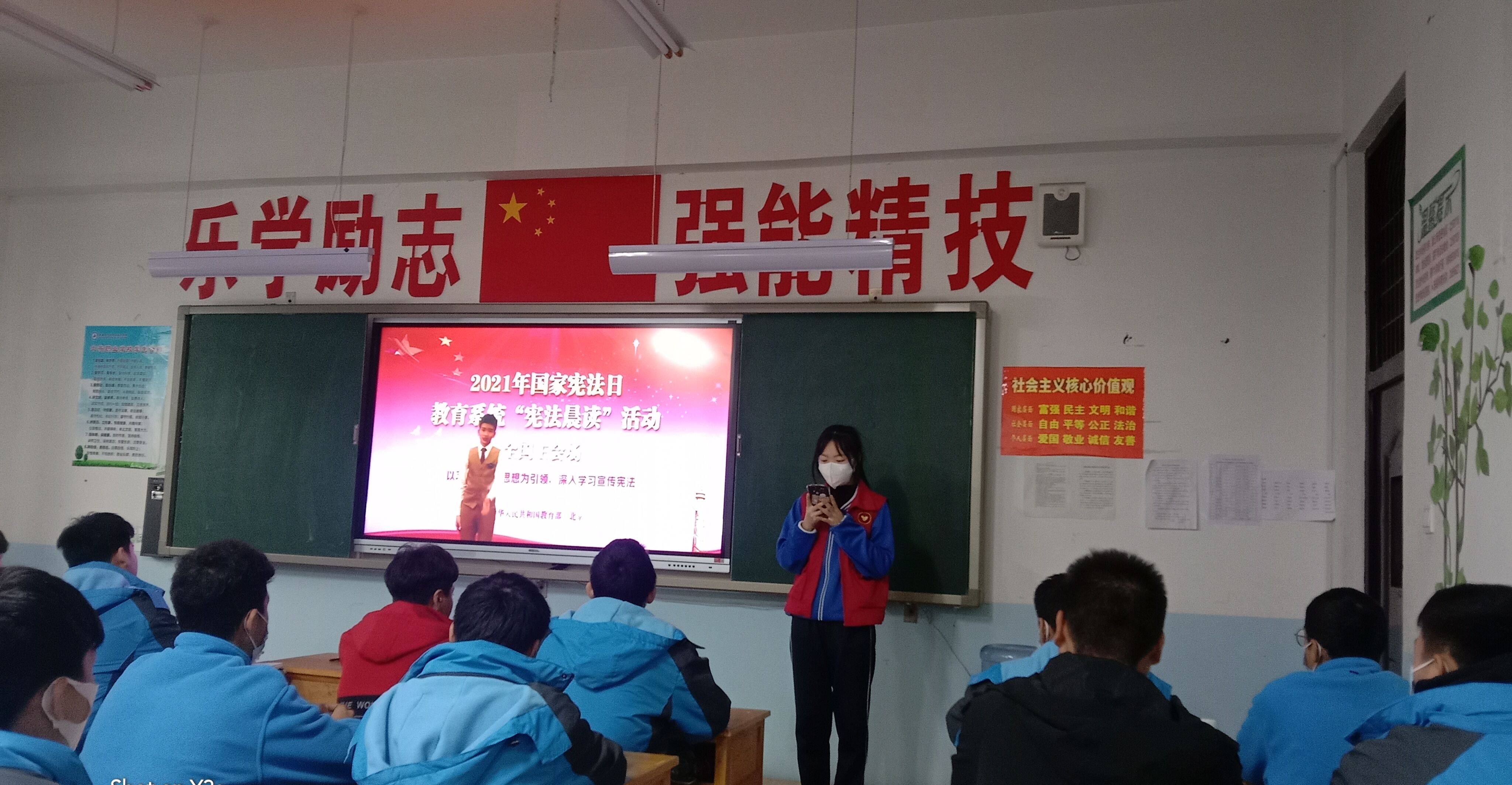11月29日,中职分院在北校区举行了升旗仪式,志愿者迎着凛冽的寒风进行了宪法的讲解说明,过往同学驻足认真聆听学习,取得了良好的宣传教育效果11月29日——12月4日,分院志愿者前往各个班级开展了“宪法晨读”活动。通过本次的晨读使各位同学了解了关于《中华人民共和国宪法》的基本知识,并提醒各位同学们要做一个知法守法的公民。12月3日,团总支学生会组织各班绘制了关于12·4宪法日的黑板报、手抄报和征文,使得每位同学把“宪法至上”的思想贯彻到底。12月4日,为了使全校同学们能身临其境地体会到法律的权威,营造一个和谐稳定的校园生活,同学的积极踊跃举办了“模拟法庭”活动,并且邀请了中职分院党总支书记张海芸、副院长马木提、学生管理办公室主任周吉新、团总支书记马胜兰莅临参与本次活动。张海芸书记提醒各位同学要尊法守法,校园不是无法之地,希望同学们铭记于心,牢记于怀。