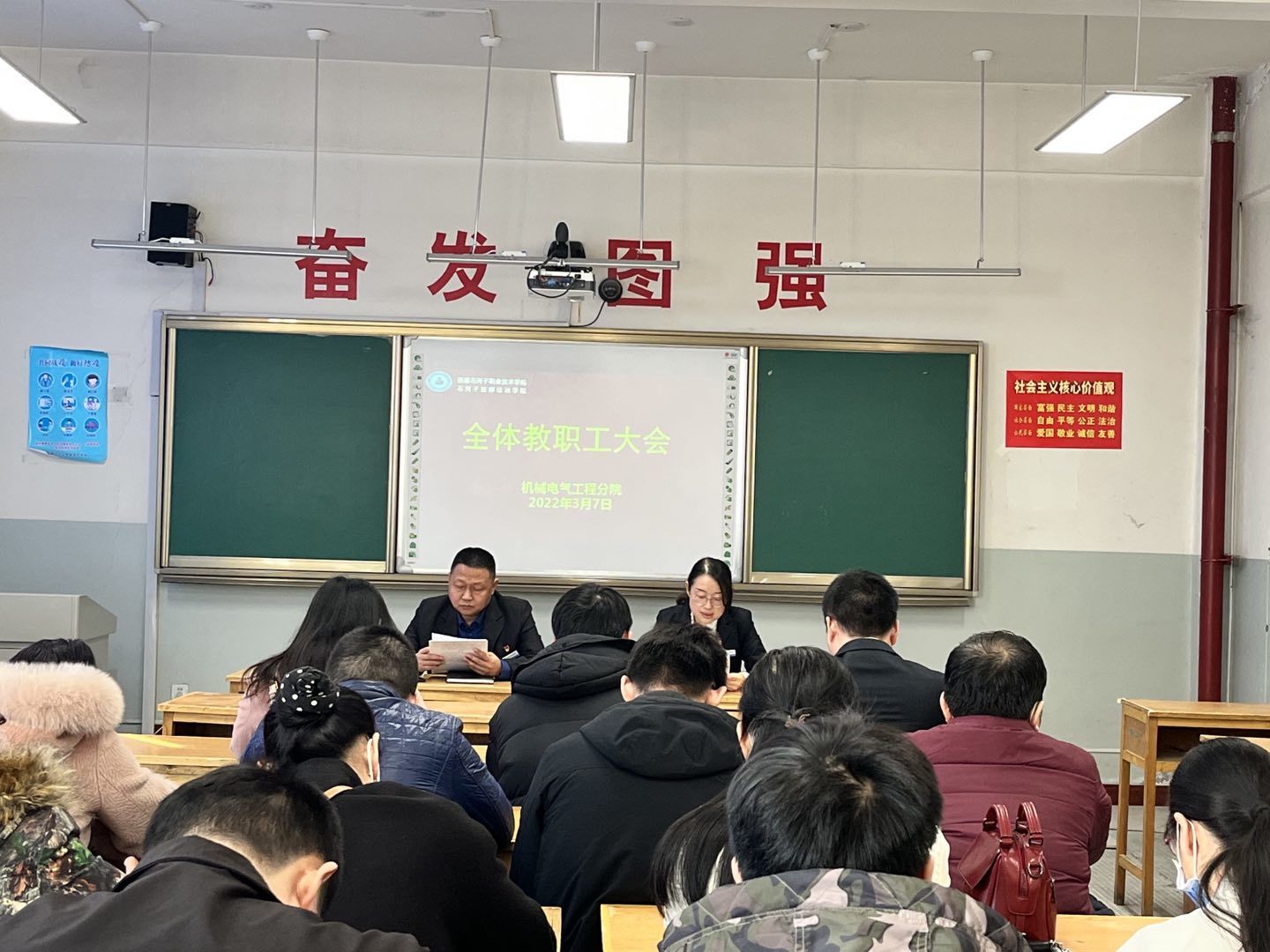 为提升学院2022年思想政治工作质量,严格疫情防控常态化下的校园管理,2022年3月7日机械电气工程分院全体教职工对相关方案及规定进行学习与研讨,机电分院党总支辛延波书记主持会议。