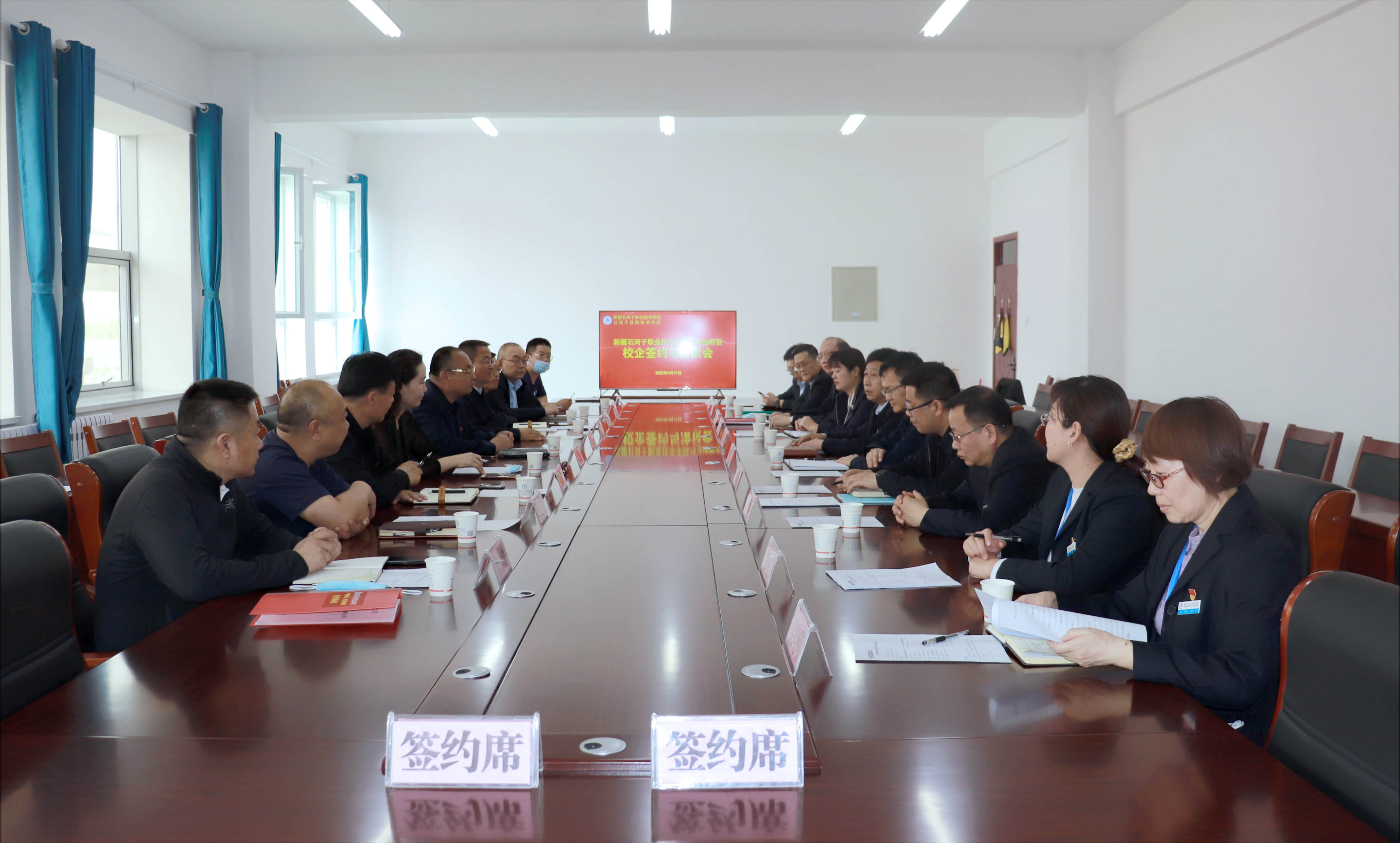 (袁晓栋报道)为深化石河子市、玛纳斯县兵地职业院校交流,形成一体发展,优势互补的合作机制,推进两地职业教育深度融合, 2022年4月19日,玛纳斯县副县长张涛、人社局局长谢彦泽、就业局党支部书记冯雪梅及玛纳斯职业教育相关单位领导一行九人来到Beat365中文官方网站,双方领导开展签约及校企合作座谈会。学院院长林炯,副院长李卫、马彩梅及相关科室、部门负责人参加了签约及座谈会。