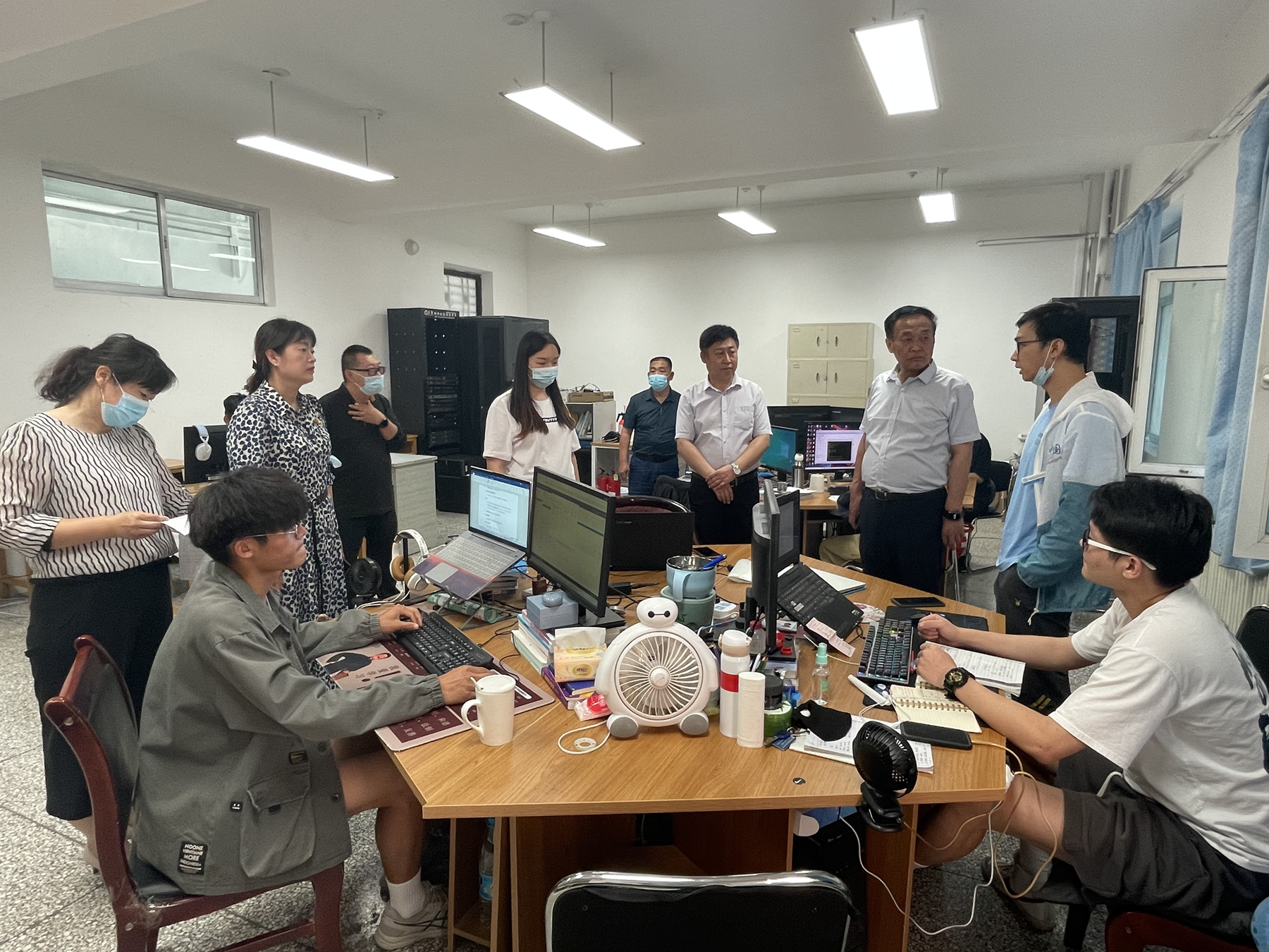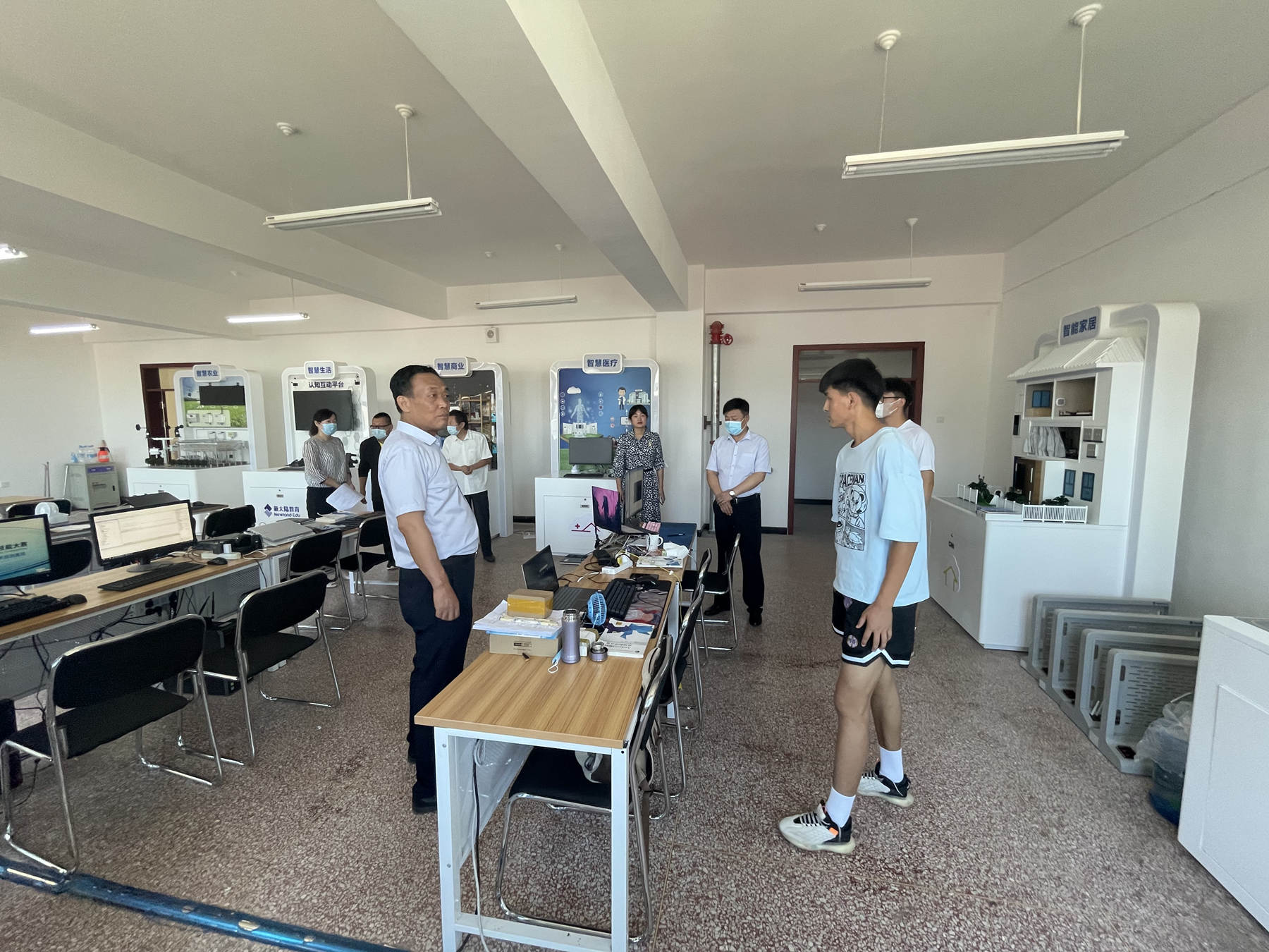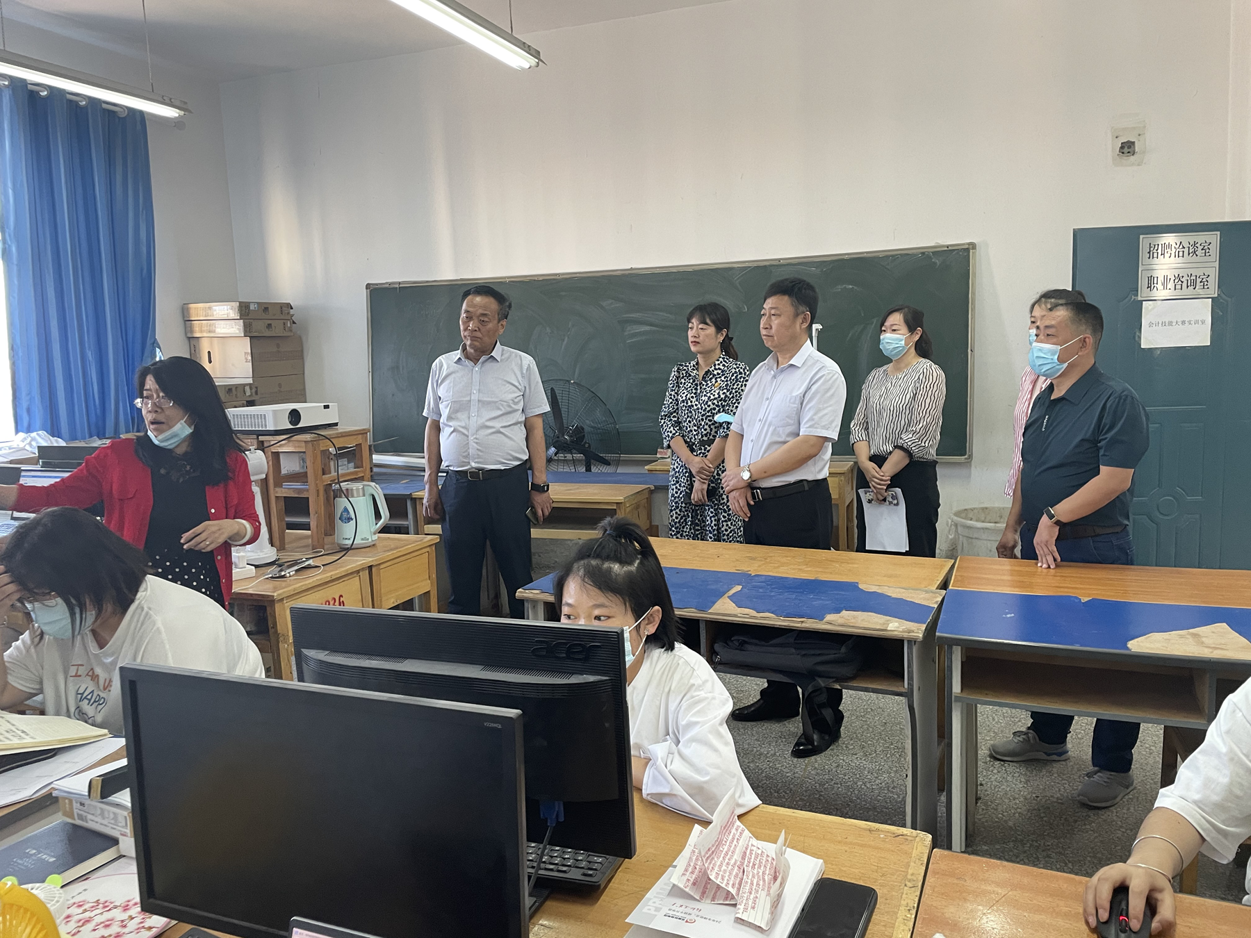(尹升鹏报道)2022年6月5日下午,学院党委书记史文革、院长林炯、副院长马彩梅,在教务处人员陪同下对学院参加2022年全国职业院校技能大赛物联网、工业设计技术、智能财税、电子商务等赛项的备赛情况进行了抽查。学院领导详细了解了各参赛选手的备赛、生活情况,对于指导教师和学生提出的备赛困难,学院领导现场办公,解决了各参赛队的后顾之忧。检查期间看到因天气炎热,训练场地分散且饮水不便,学院领导专门安排给大赛训练人员配发矿泉水用于降温解暑,充分体现出学院对备赛师生的关怀。