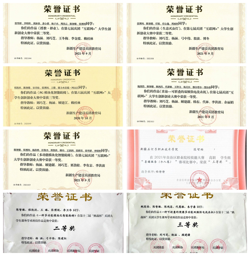 每一份荣誉的取得都是拼搏努力的结果。刚入校的时候,陈智璐是一个性格内向的姑娘,但是老师很快发现她有一股子韧劲儿,做事非常踏实认真,鼓励她参加各种大赛。在备战技能大赛期间,她几乎全天都泡在实训室里,老师手把手指导,日日夜夜的陪伴。她不懂就问,不会就练,高标准、严要求,从不敢有丝毫马虎,辛勤的汗水换来的是成绩一跃而上,从院内选拔、再到兵团初赛,到最后走上第七届中国国际“互联网+”创新创业大赛金奖的领奖台。比赛不仅检验了她专业知识的牢固程度,也激发了她个人的创意和潜力,同时也锻炼了个人动手操作能力和自我调整的能力。在校期间,陈智璐先后荣获第七届中国国际“互联网+”创新创业大赛金奖,第七届兵团“互联网+”大学生创新创业大赛一等奖2个、二等奖2个(团体),第六届“互联网+”大学生创新创业大赛三等奖(团体),第十二届“挑战杯”兵团大学生课外学术科技作品竞赛二等奖、三等奖(团体),2021年“璟源国旅杯”新疆维吾尔自治区职业院校高职组“导游服务”技能大赛省级三等奖等荣誉。