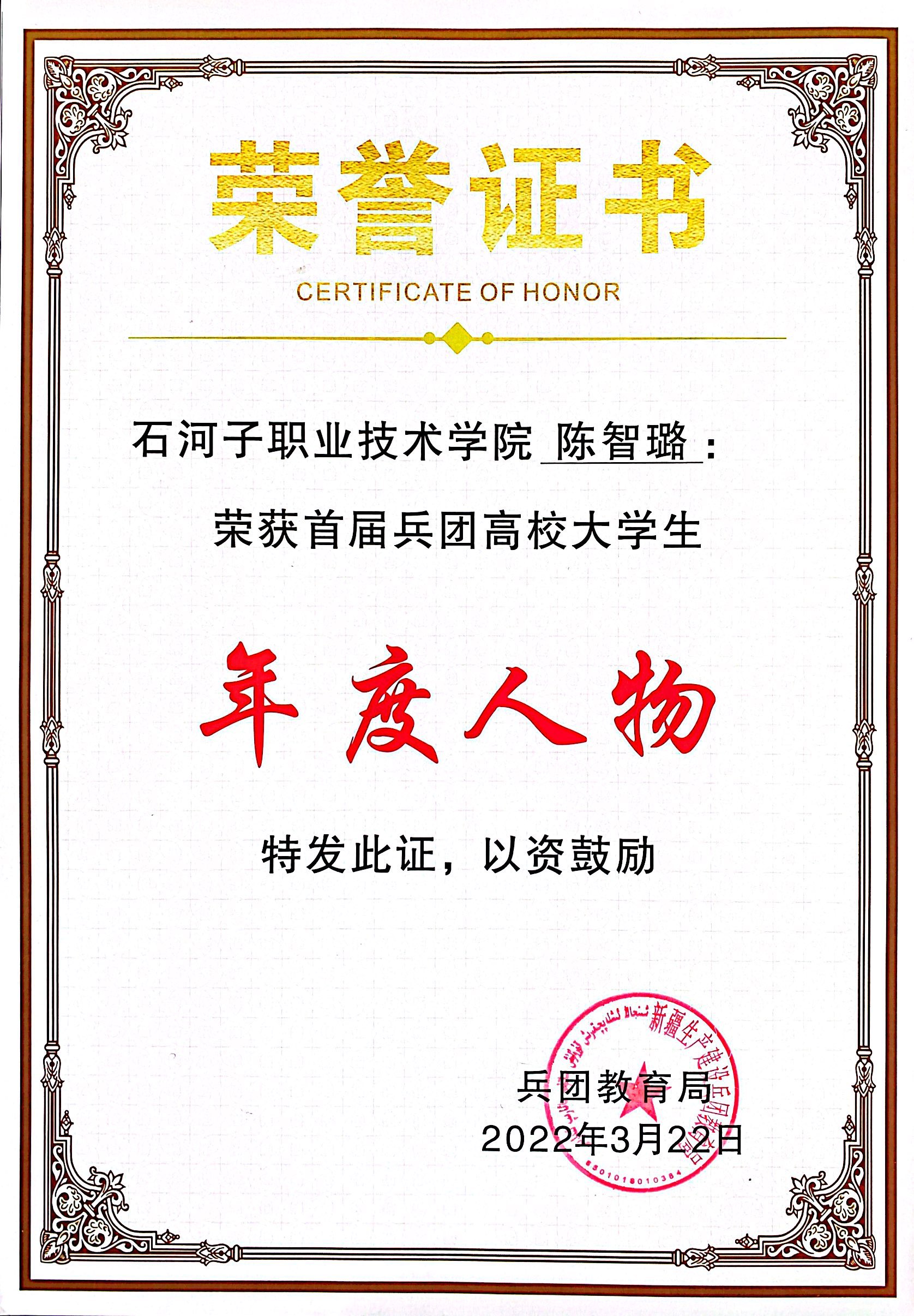 (王鑫 王需报道)近日,喜讯传来,Beat365中文官方网站2019级旅游管理专业学生陈智璐荣获首届兵团高校大学生年度人物称号。陈智璐,女,汉族,2001年6月生,预备党员,现已免试升入本科——新疆师范大学旅游管理专业。荣获第七届中国国际“互联网+”创新创业大赛金奖,省部级奖项6项,校级奖项2项。