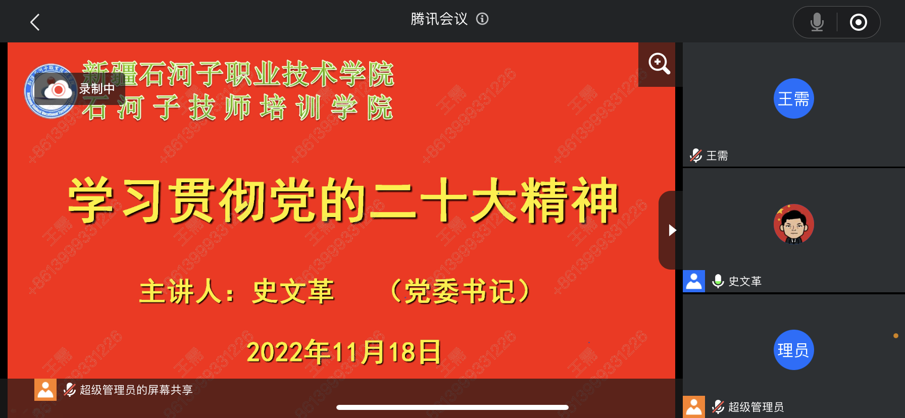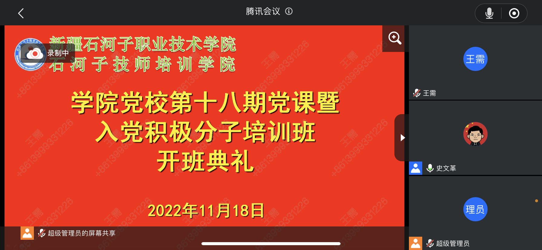 开班仪式结束后,史书记为培训班学员进行了第一次授课,授课主题为“党的二十大精神宣讲”。史书记在讲课中解读了党的二十大精神的主要内容、科学内涵和精神实质,并以生动鲜活的案例帮助师生深化思想认识,他指出,党的二十大精神内容十分丰富,同学们要在深学细研上下功夫,读原著、学原文、悟原理,做到对习近平新时代中国特色社会主义思想中的重大论断、重大观点、重大要求了然于胸、烂熟于心;要在融会贯通上下功夫,把学习习近平总书记在党的二十大所作的报告同学习习近平总书记治国理政新理念新思想新战略,同学习习近平总书记视察新疆、视察兵团重要讲话指示精神结合起来,深入理解内涵,精准把握外延,吃透精髓要义;要在知行合一上下功夫,紧密联系当前发展实际,结合大学生成长实际,切实把党的二十大精神学懂弄通、学深悟透,深入开展贯彻落实党的二十大精神,围绕新时代新思想新实践,讲述新青年新奋斗的生动故事,更好地扛起新使命、谱写新篇章。