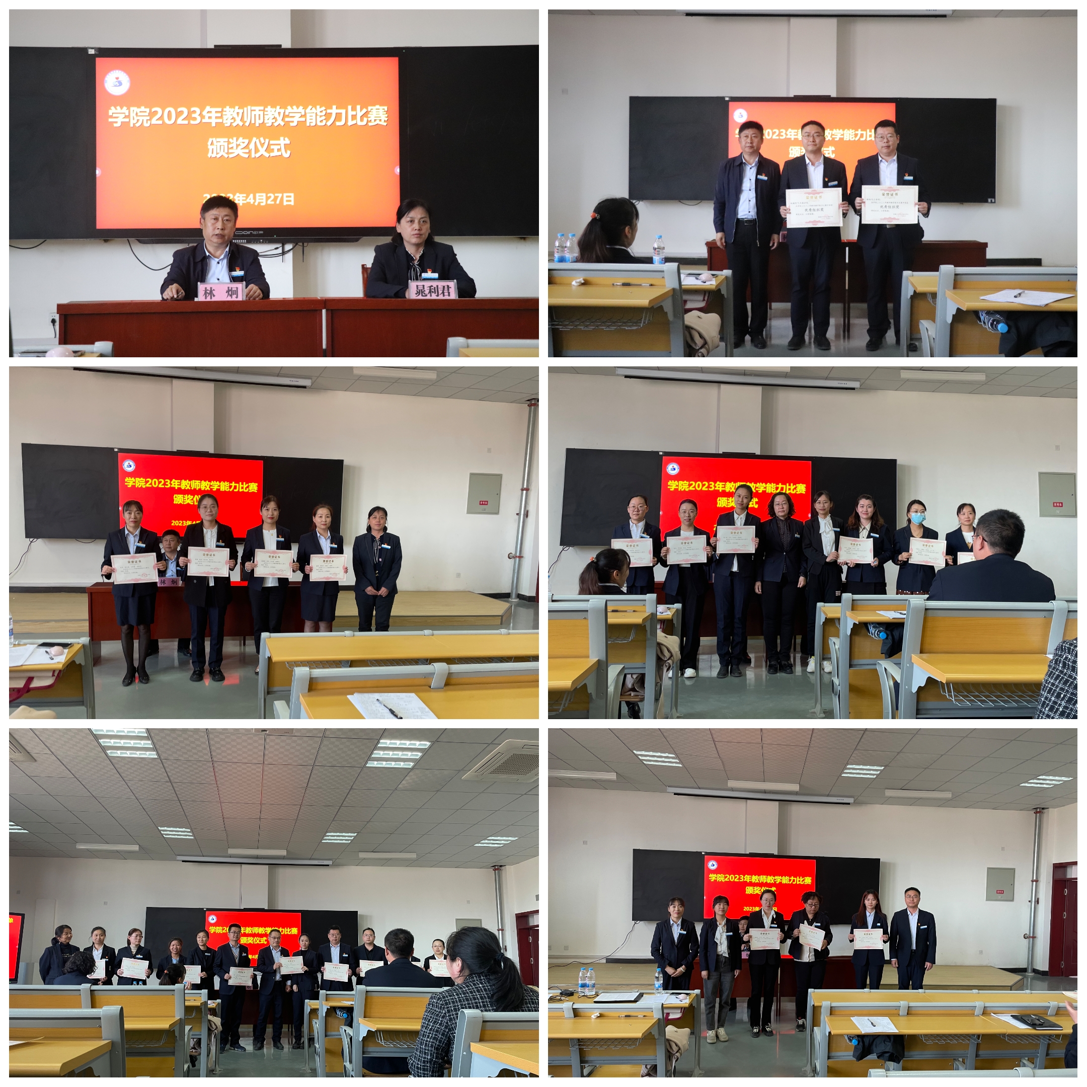 (科研处报道)4月26-27日,学院2023年教师教学能力比赛现场决赛在南办公楼副楼201阶梯教室举行。本次比赛由科研处主持,学院党委书记史文革、学院院长林炯、学院副院长马彩梅亲临现场指导,教务处处长徐海霞、各分院院长和5位具有资深参赛经验的教师担任现场决赛的评委,部分教师代表到场观摩。