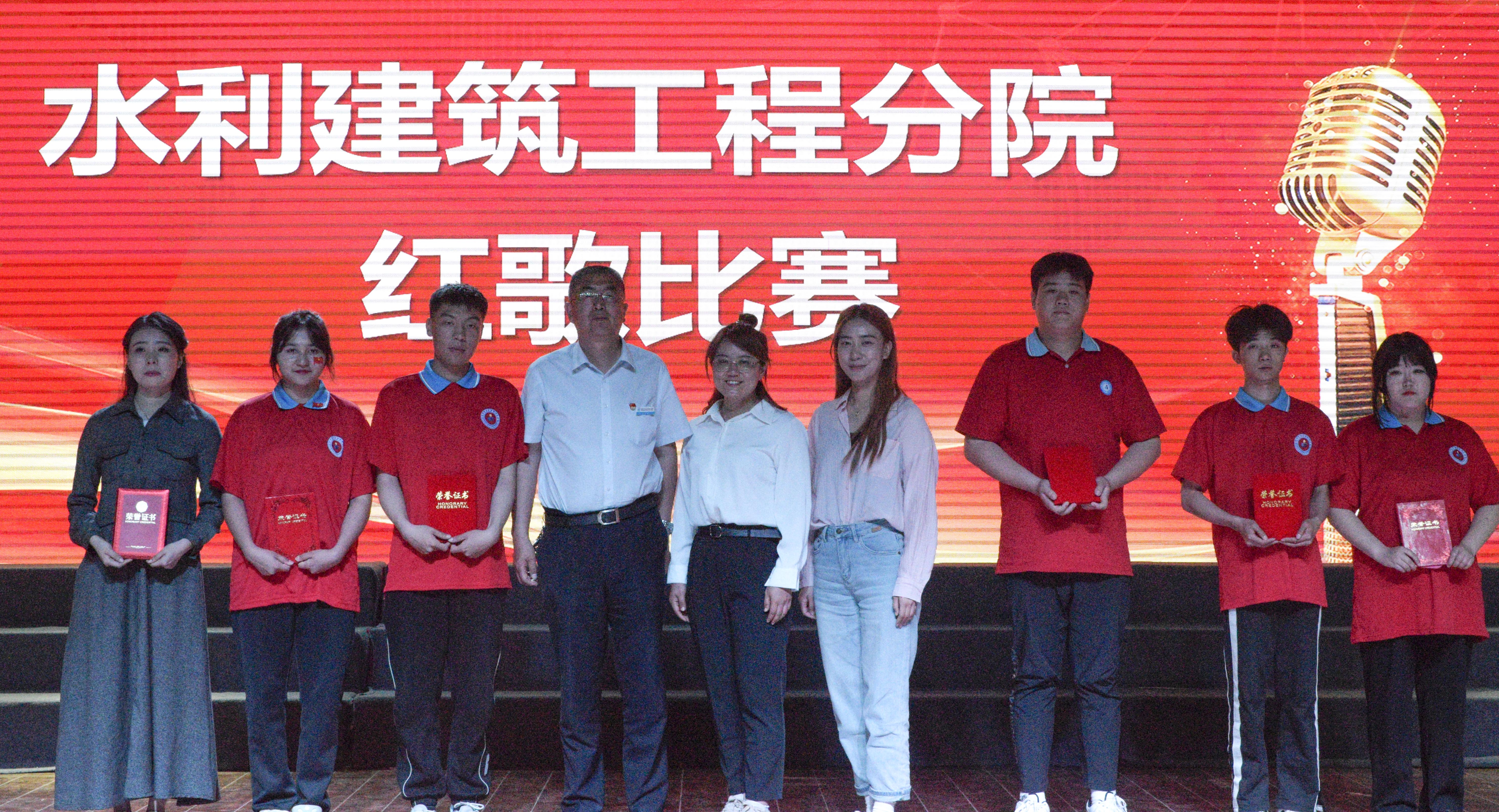 (朱秀明报道)按照学院党委的统一安排部署,加快构建“大思政”体系,落实立德树人根本任务,同时为弘扬爱国精神,重温红色经典,丰富校园文化生活,增强班级凝聚力,唱响时代梦想,6月1日石河子职业技术学院水利建筑工程分院举办了“一首红歌,一面旗帜”为主题的红歌合唱比赛。水利建筑工程分院领导俞峰、张婷及师生代表700余人一同观看了比赛。