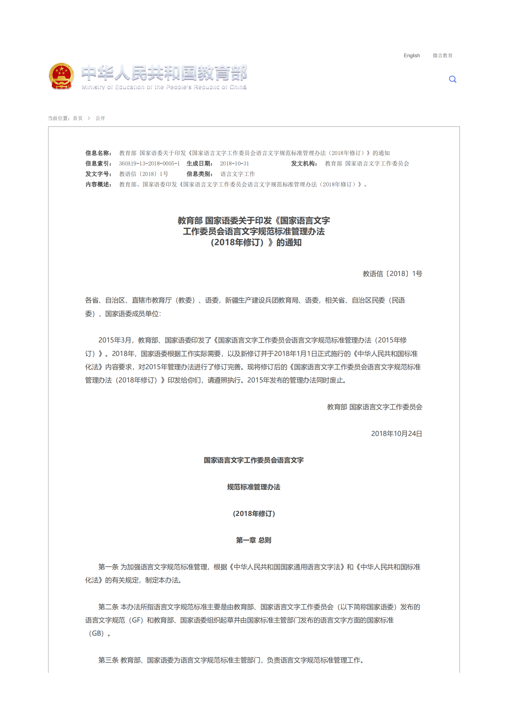 教育部 国家语委关于印发《国家语言文字 工作委员会语言文字规范标准管理办法 (2018年修订)》的通知