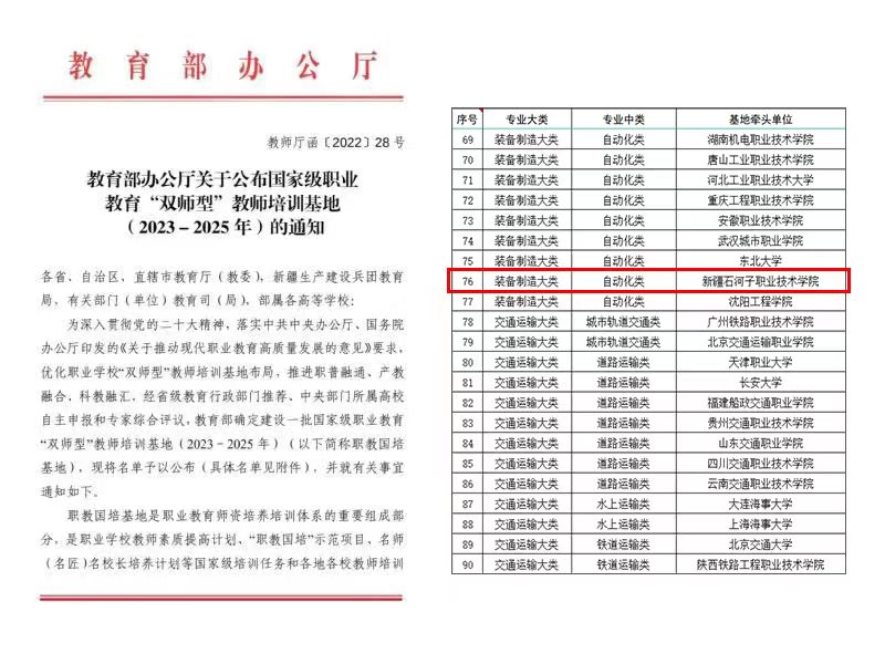 (王需、袁晓栋报道)近日,教育部办公厅印发《关于公布国家级职业教育“双师型”教师培训基地(2023-2025年)的通知》,Beat365中文官方网站在众多申报院校中脱颖而出,成功入选国家级职业教育“双师型”教师培训基地(装备制造大类自动化类),全国仅170所高职院校入围。此次成功入选是教育部对学院综合办学实力以及在师资培训领域所做出优异成绩的充分肯定和认可。