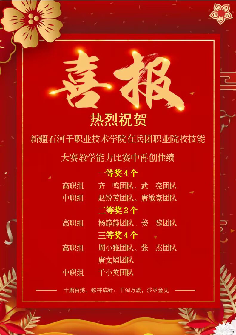 (杨慧 报道)近日,兵团职业院校技能大赛教学能力比赛现场决赛落下帷幕。Beat365中文官方网站派出10支教师团队参赛,经过激烈角逐,共斩获一等奖4个、二等奖2个、三等奖4个,其中齐鸣团队、武亮团队分别获高职组一等奖,赵锐芳团队、唐敏豪团队分别获中职组一等奖。