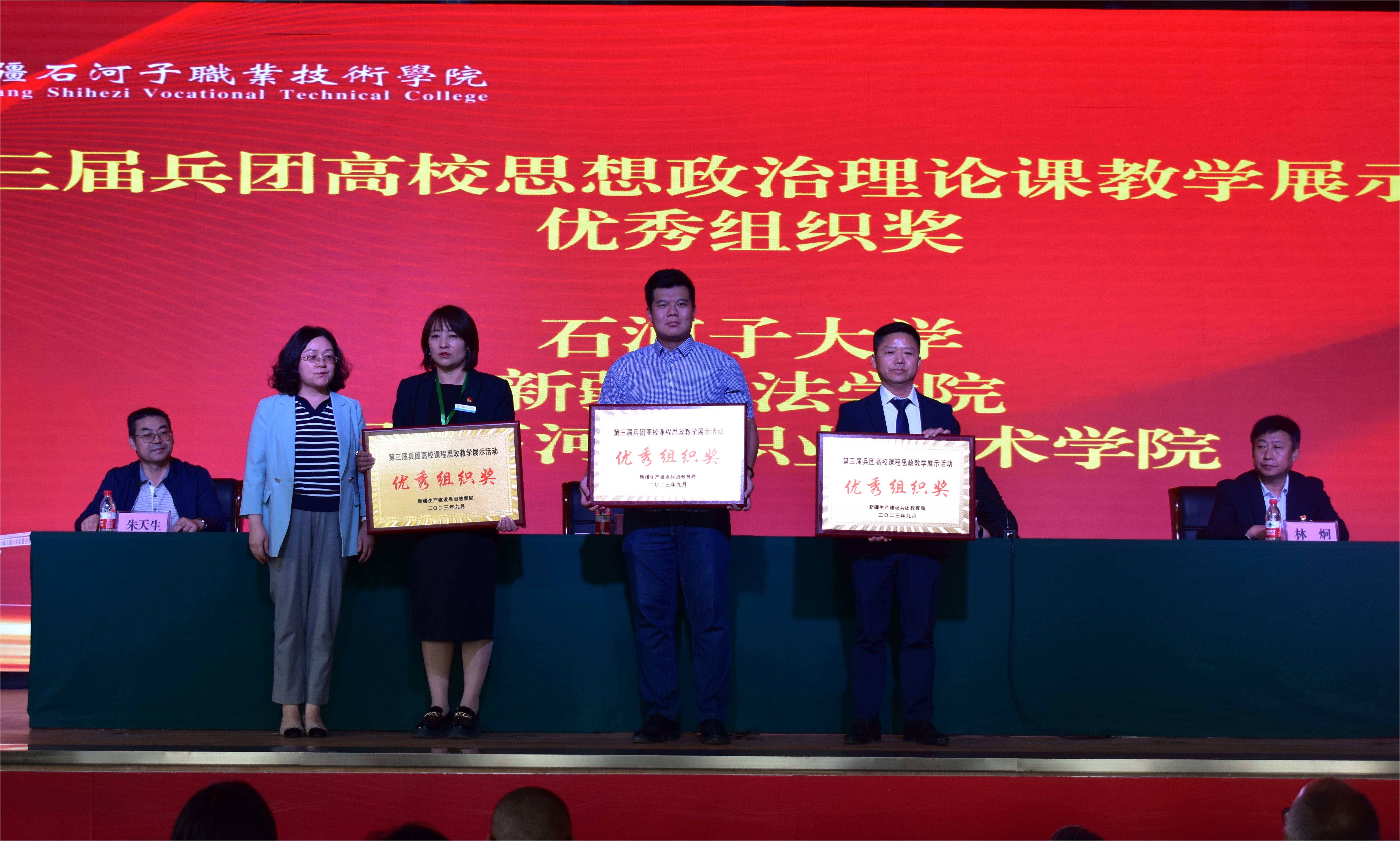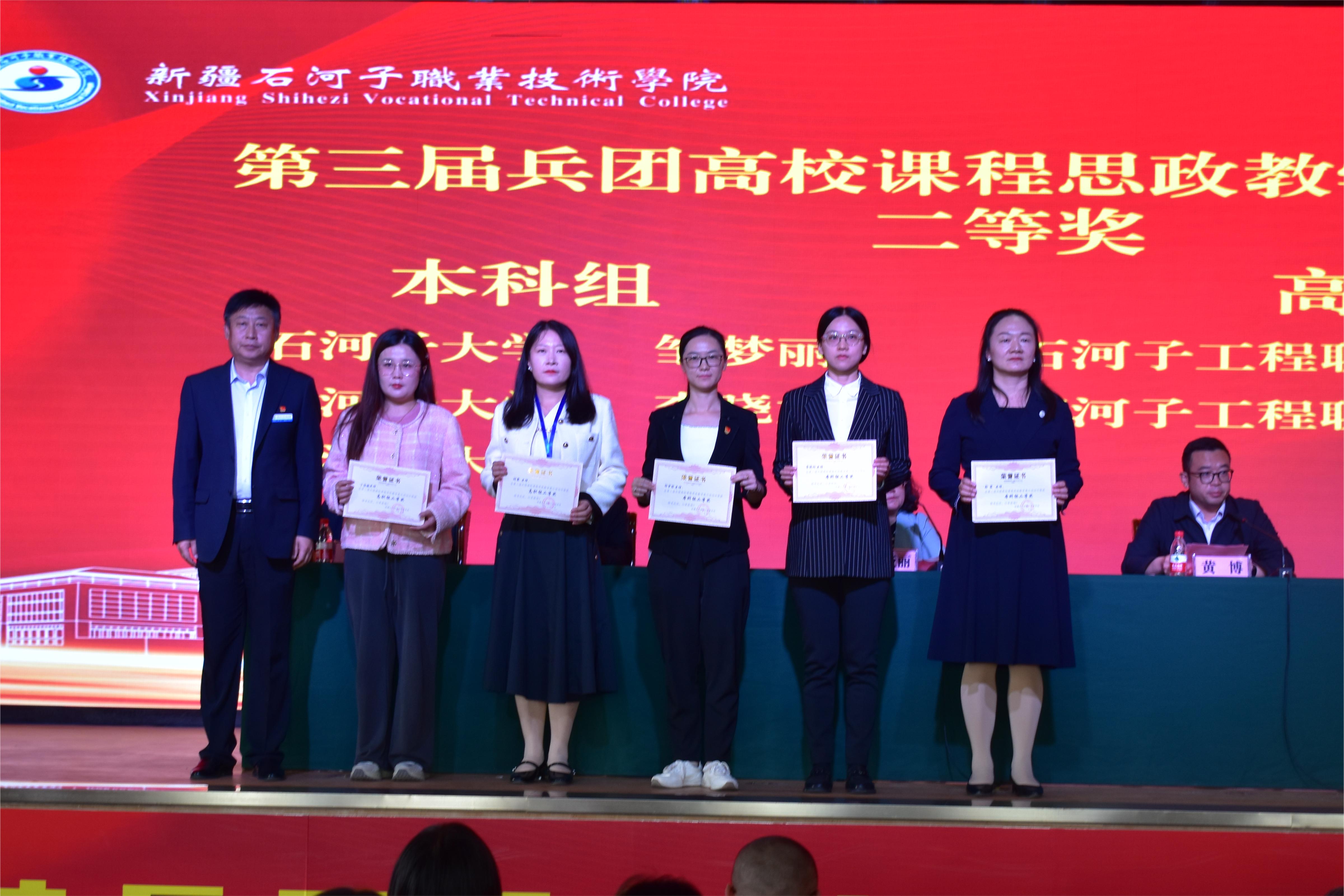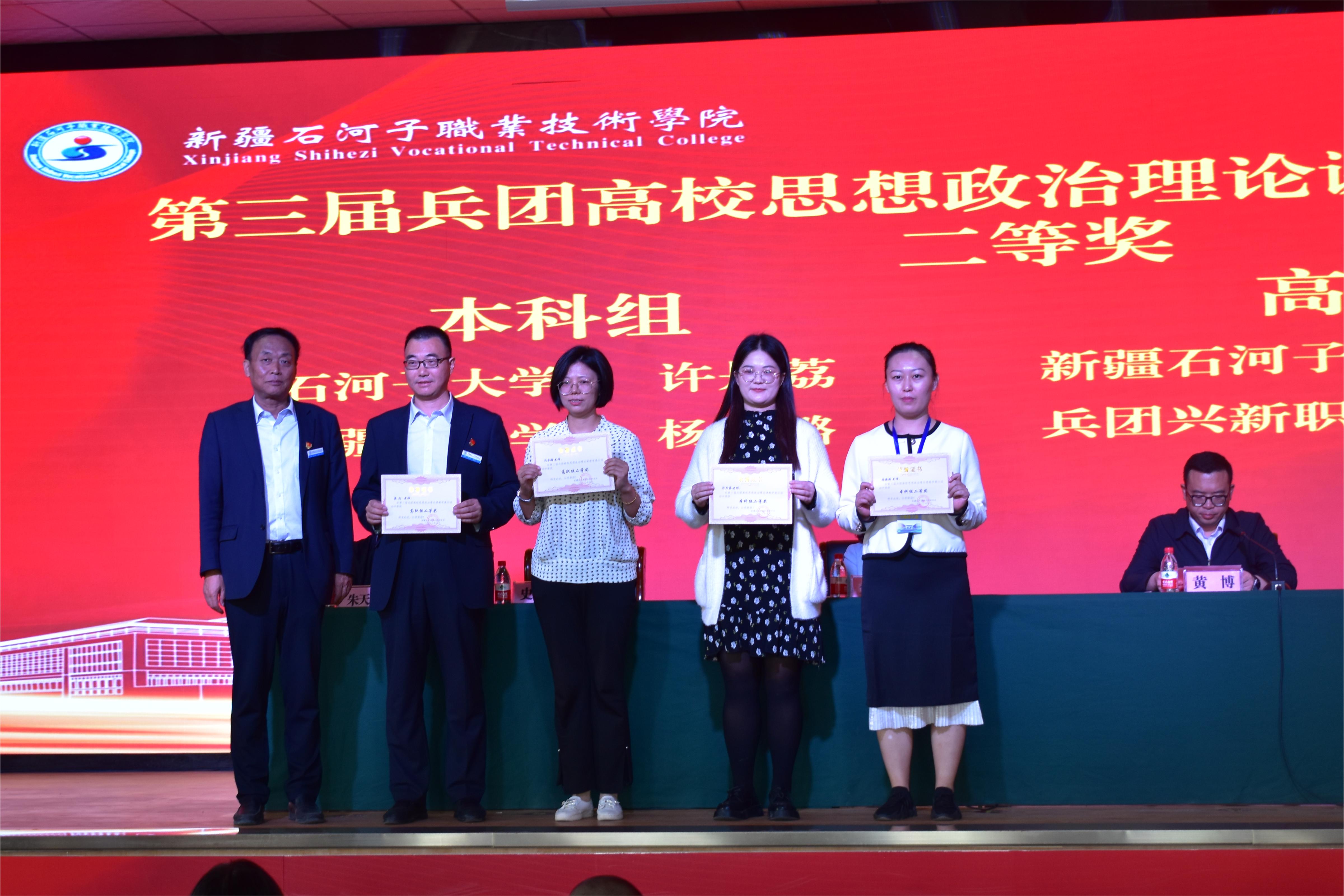 兵团教育局思政处处长金亚丽宣布了比赛结果,各位领导分别为获奖教师颁发证书。Beat365中文官方网站6名教师获奖,其中2人获一等奖、1人获二等奖、3人获三等奖,学院获兵团高校思想政治理论课教学展示活动优秀组织奖。