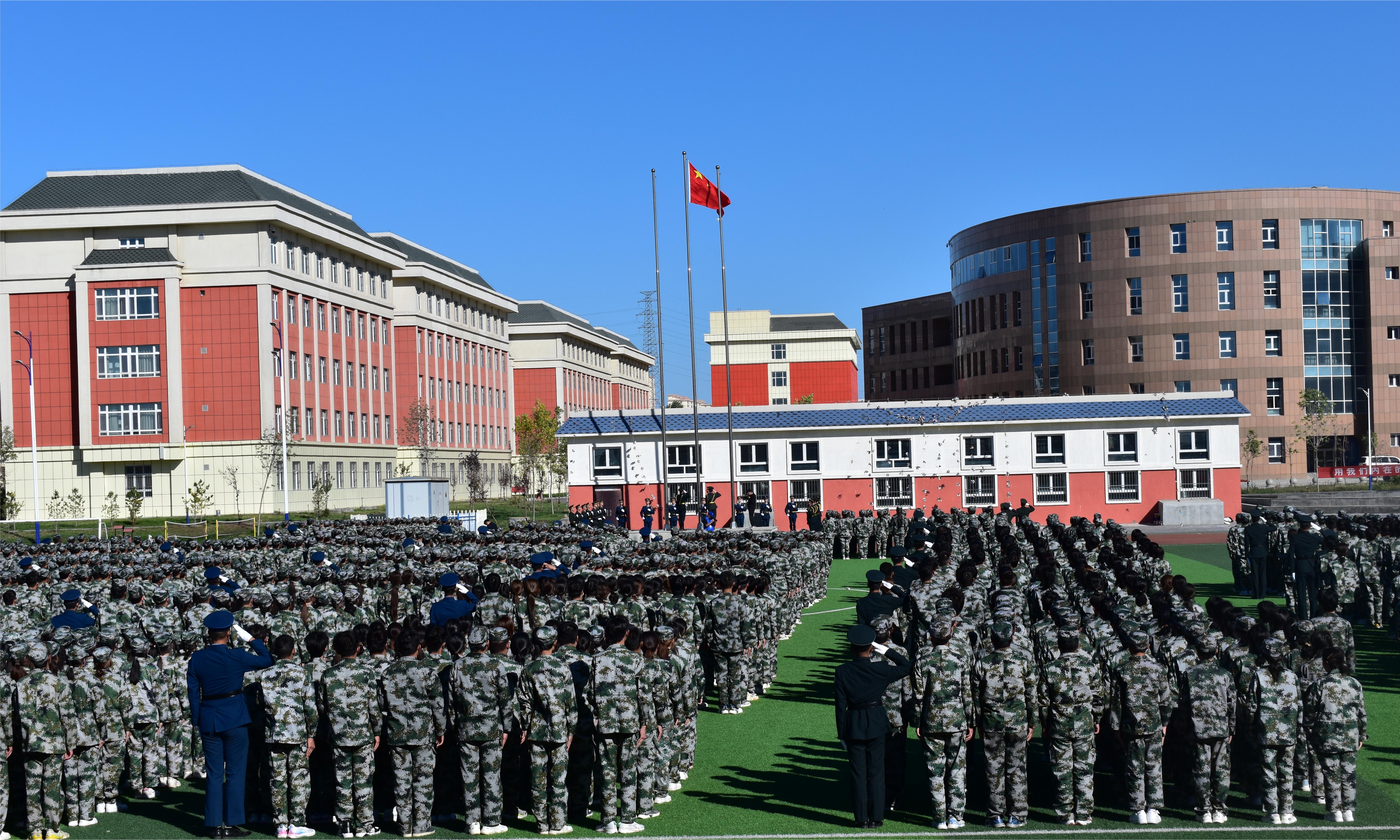 伴着激昂雄壮的国歌,五星红旗冉冉升起,典礼正式开始。3000余名参训学生整齐列队,以高昂的士气接受检阅。分列式阅兵会操展示,53个参训学生方队踏着铿锵有力的步伐,雄赳赳、气昂昂地通过主席台,展现了2023级新生良好的精神风貌。200名优秀的参训学生分男女生两个方阵展示了军体拳。