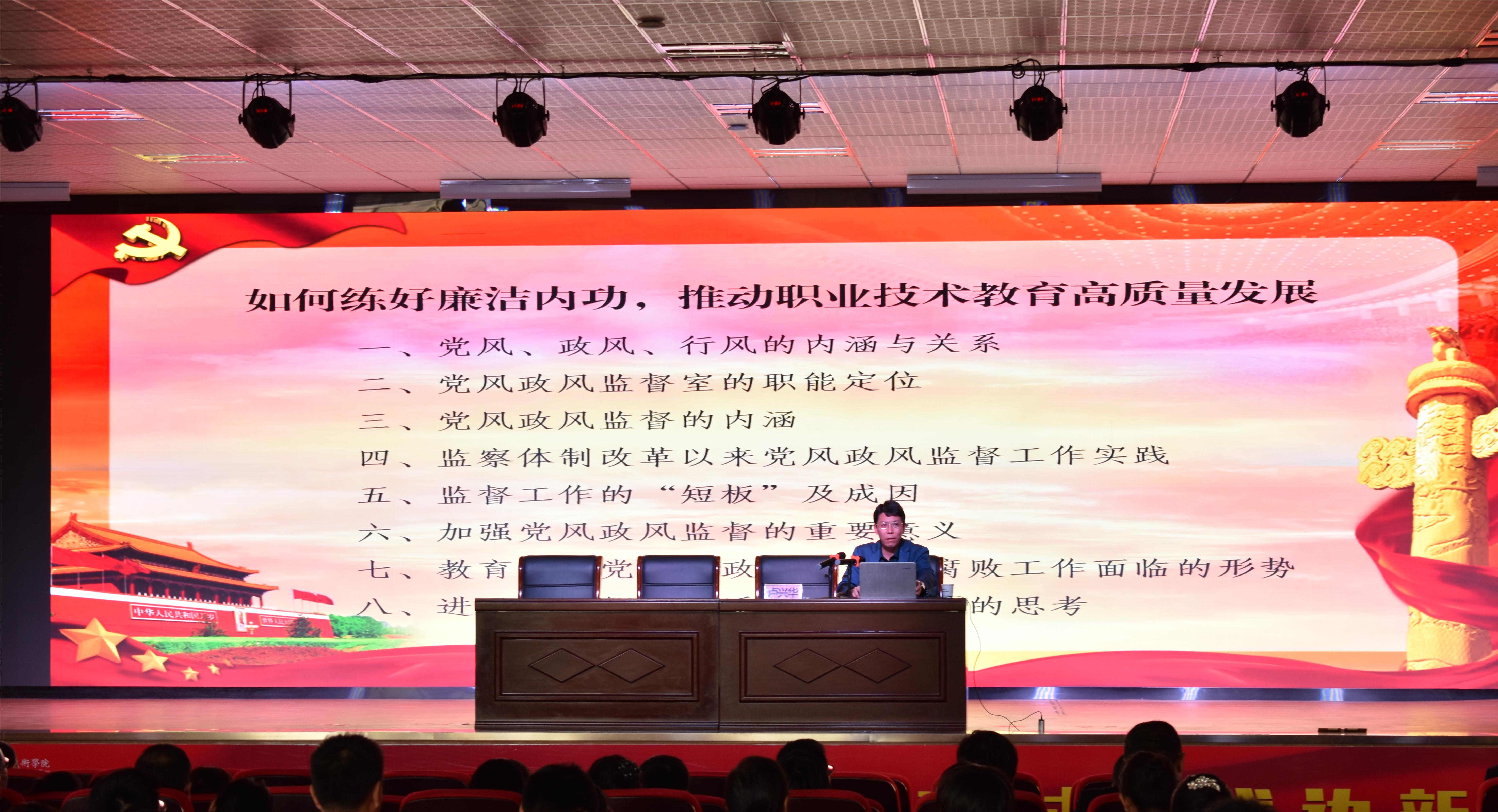 (徐萌萌 报道)为进一步加强新时代廉洁文化培育和教师职业道德建设,扎实推进党风廉政,教育引导广大教师干净廉洁、忠诚担当,2023年9月28日,在新疆石河子职业技术学院南附楼阶梯教室,学院邀请师市纪委监委党风政风监督室主任卢兴华作题为《如何练好廉洁内功,推动职业技术教育高质量发展》廉政教育专题培训,学院全体教师参加此次培训。