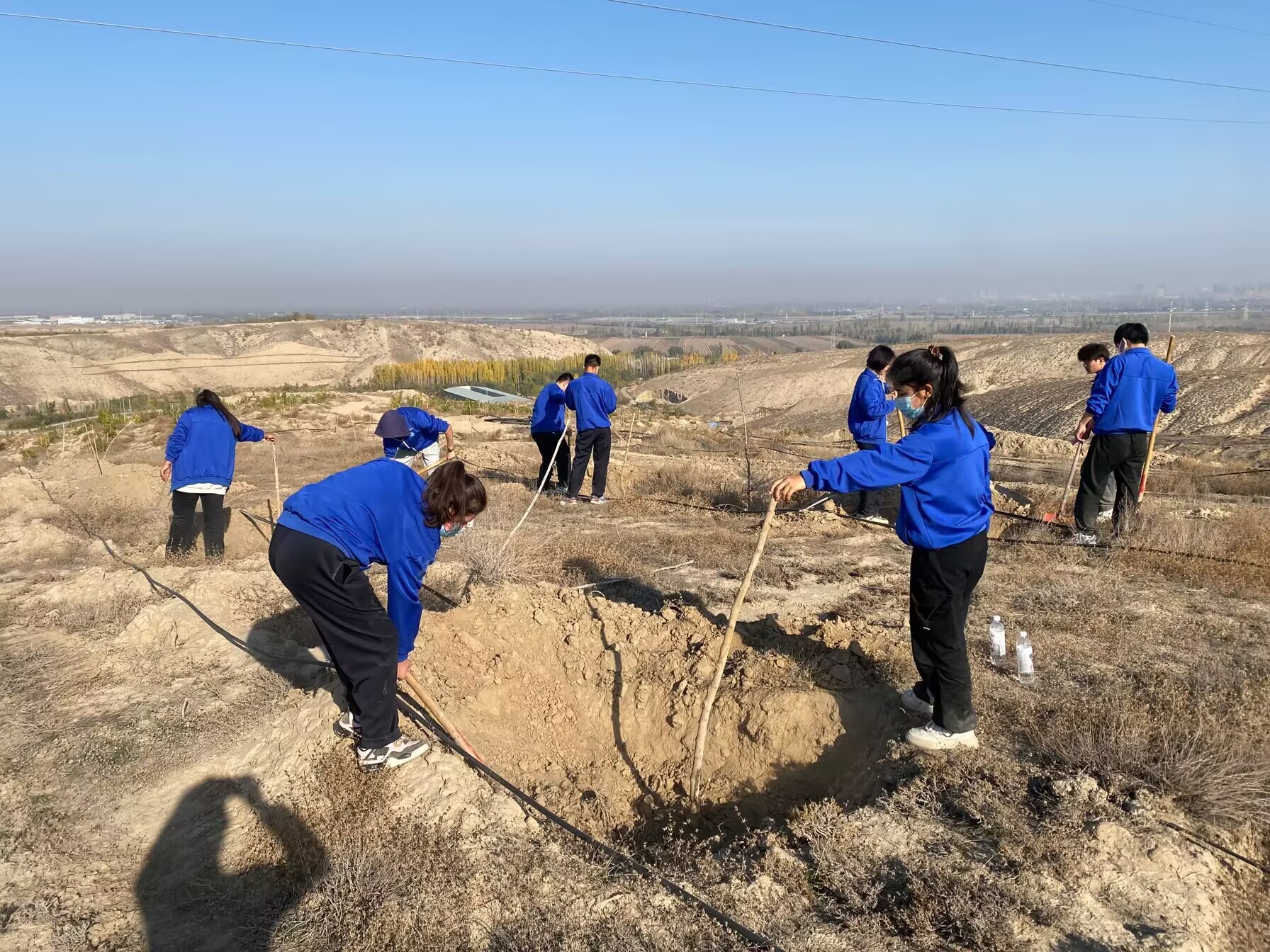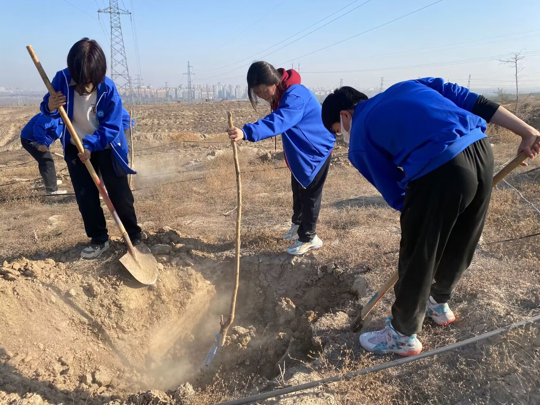 植树现场,团员青年们斗志昂扬、干劲十足,三三两两各成一组,分散有序开展植树活动。有的挥锹铲土,有的扶苗踩实,栽得认真、干得卖力,一丝不苟地完成每一道工序,精心栽下每一棵树苗,200余棵新载苗木在蓝天下迎风挺立,展现着蓬勃的生机活力,使大家在享受着公益劳动快乐的同时,也为生态文明添上一簇簇新绿。