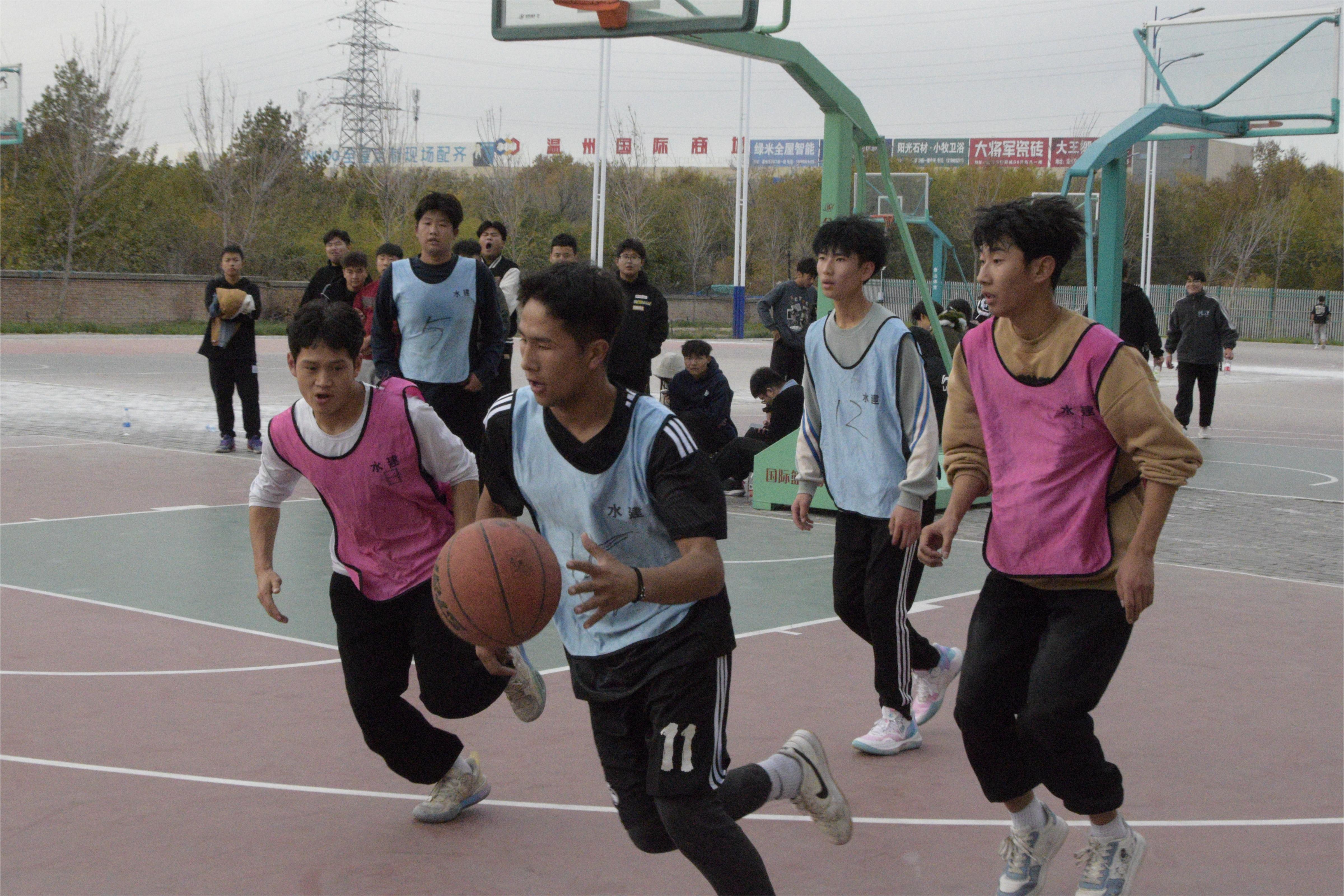 篮球比赛也进行得如火如荼,随着一声清脆的哨声,队员们随即展开了激烈的比拼,突破、上篮、快攻、抢断,队员个个斗志昂扬,伴随着灵活的动作和坚定的目光,不断抢球、防守、进攻,一系列动作如行云流水般一气呵成。精准的投篮、华丽的过人、严密的防守,都让在场的观众们热血沸腾。各队队员之间利用精妙的配合加快攻防转换节奏,不断拉大比分差距。赛场上队员们默契的配合、快速的抢断、有效的助攻、漂亮的投球,迎来场外观众的阵阵喝彩和掌声。最终,水利工程技术专业凭借稳定的发挥和精准的射篮,赢得了比赛的胜利。