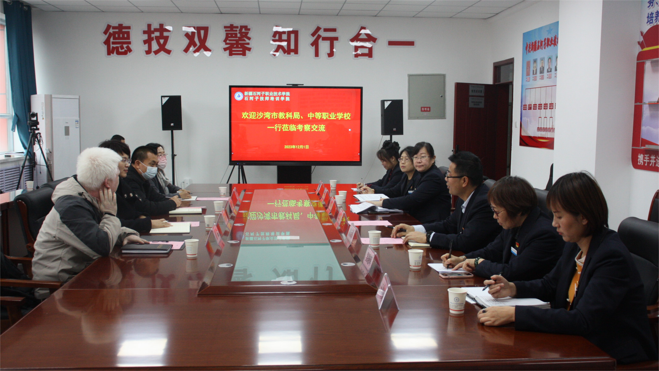 (徐千然 报道)为切实推进中高职衔接、促进人才一体化培养,2023年12月1日,沙湾市教科局局长马琴、沙湾中等职业技术学校党支部书记蒲建浩一行四人莅临学院开展考察交流工作,学院副院长张金果、教务处处长徐海霞及各部门负责人陪同考察。本次交流座谈会由张金果副院长主持。