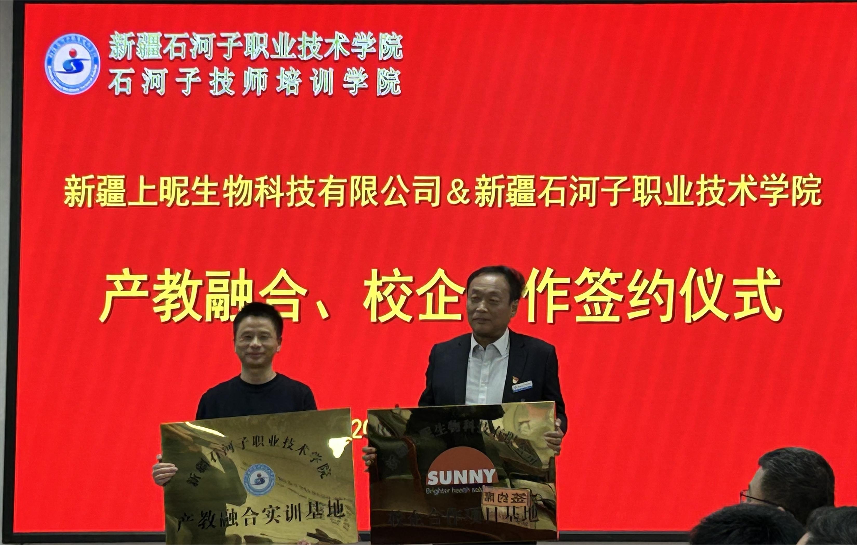 熊正军总经理与院长林炯签订合作协议,史文革书记为新疆上昵生物科技有限公司授牌。根据合作协议,双方将坚持“共建服务基地,服务就业创业”的原则,合作共建产学研结合示范基地,为学生搭建教学实践、实习和创业平台;共同探索和开展“订单式人才培养与输送方案”,共同培养、选拔高技能人才进行订单式培养与推荐;进一步加强教师等人力资源的共享,着力打造高质量双师型教师队伍,共同提升双方科技支撑和人才智力支持;进行定期或不定期的教学工作研讨,推动双方发展动能更足、质量更优。