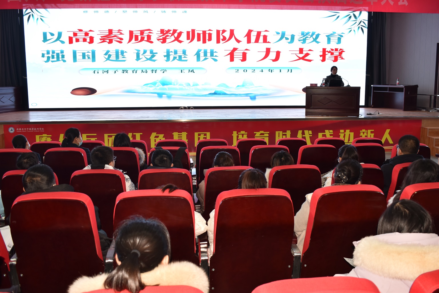 (王需 徐千然 报道)为进一步提高教师师德修养,提升全体教师课程思政教学能力,扎实推进“三教”改革,提高教师教学能力和课堂教学水平,根据学院教学工作安排及要求,2024年1月12日,学院特邀八师石河子市教育局督学、党委委员王凤作“以高素质教师队伍为教育强国建设提供有力支撑”主题的师德师风专项讲座,学院副院长张金果主持本次讲座。