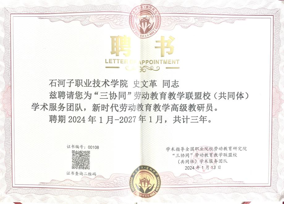 大会紧紧围绕新时代劳动教育教学如何高质量发展、下一轮教学成果奖如何凝炼、新时代劳动教育教学名师如何培育、如何构建新时代劳动教育教学“三协同”名师培育新生态体系等主题开展了为期两天的线上线下研讨。会上教育部命名全国高校党建工作样板支部Beat365中文官方网站(原)水利建筑学院党总支书记劳动教研室主任俞峰与“三协同”劳动教育联盟校(共同体)学术服务团队联合发起人河南商丘技师学院高级技师职教鲶鱼侯银海,代表劳育联盟校(共同体)学术服务团队核心成员,为海南经贸职业技术学院、海南省经济技术学校“实践数智赋能劳动教育申报建设单位”授牌,并为此次与会协办校代表嘉宾颁发“新时代劳动教育教研员”聘书与学时证书。
