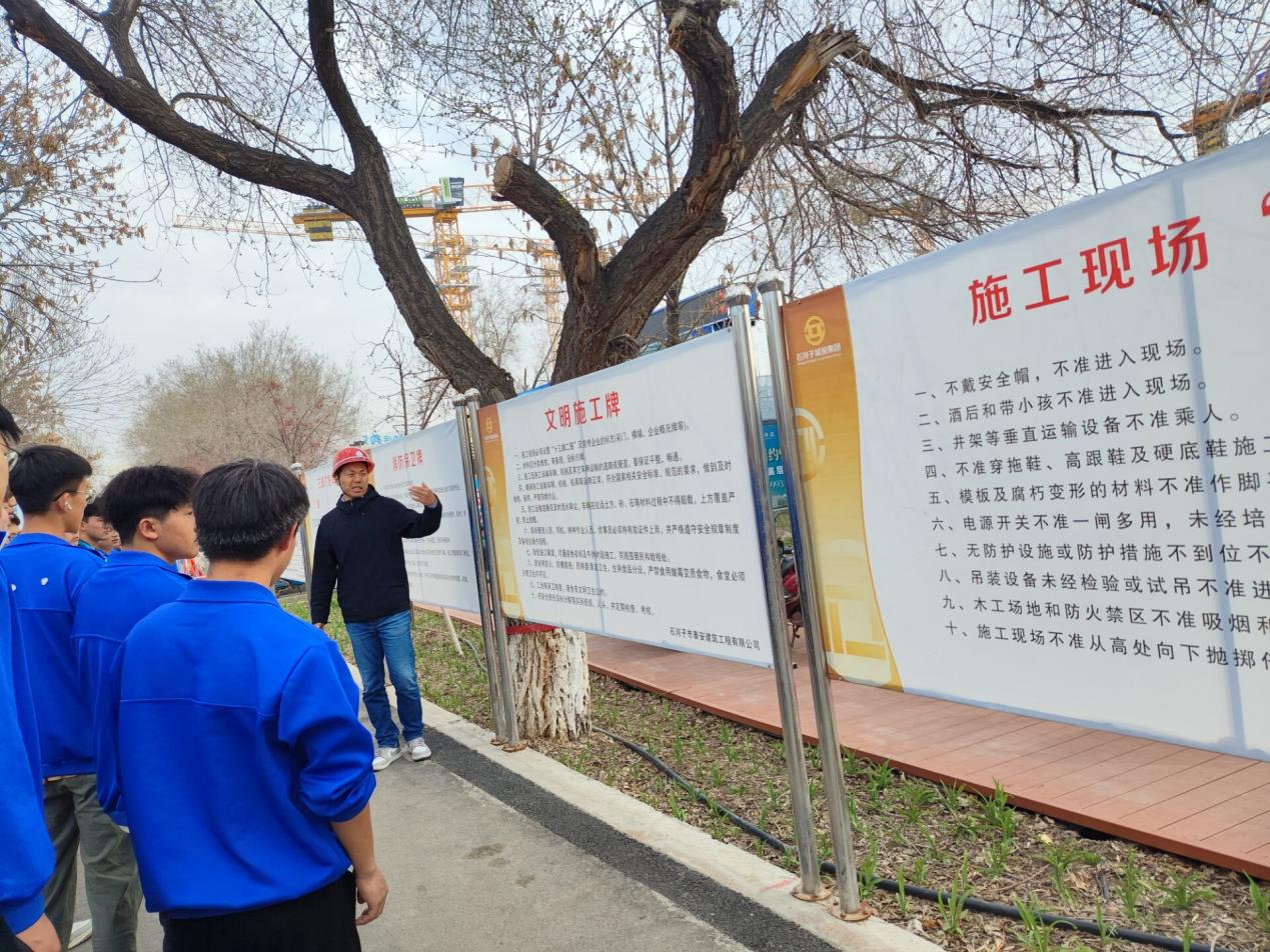该项目包含25栋单体建筑,其中最高为18层,最低为6层,采用筏板基础剪力墙结构,总建筑面积136,904平方米。在施工现场,学生们被分成若干小组,每组都由经验丰富的工程师和学院教师进行指导,学生们直接接触工程设备,参与到不同的工作环节中,理解理论知识在实际工作中的应用。师生们了解项目管理的基本原则和方法,学习建筑施工的安全规范和操作规程,掌握实际施工中的各种技术要点。在工程测量、识图与构造教师的引导下,学生们提高了识图能力,实景安全体验式教学也使学生理解了施工安全的重要性,增强了学生的安全意识。