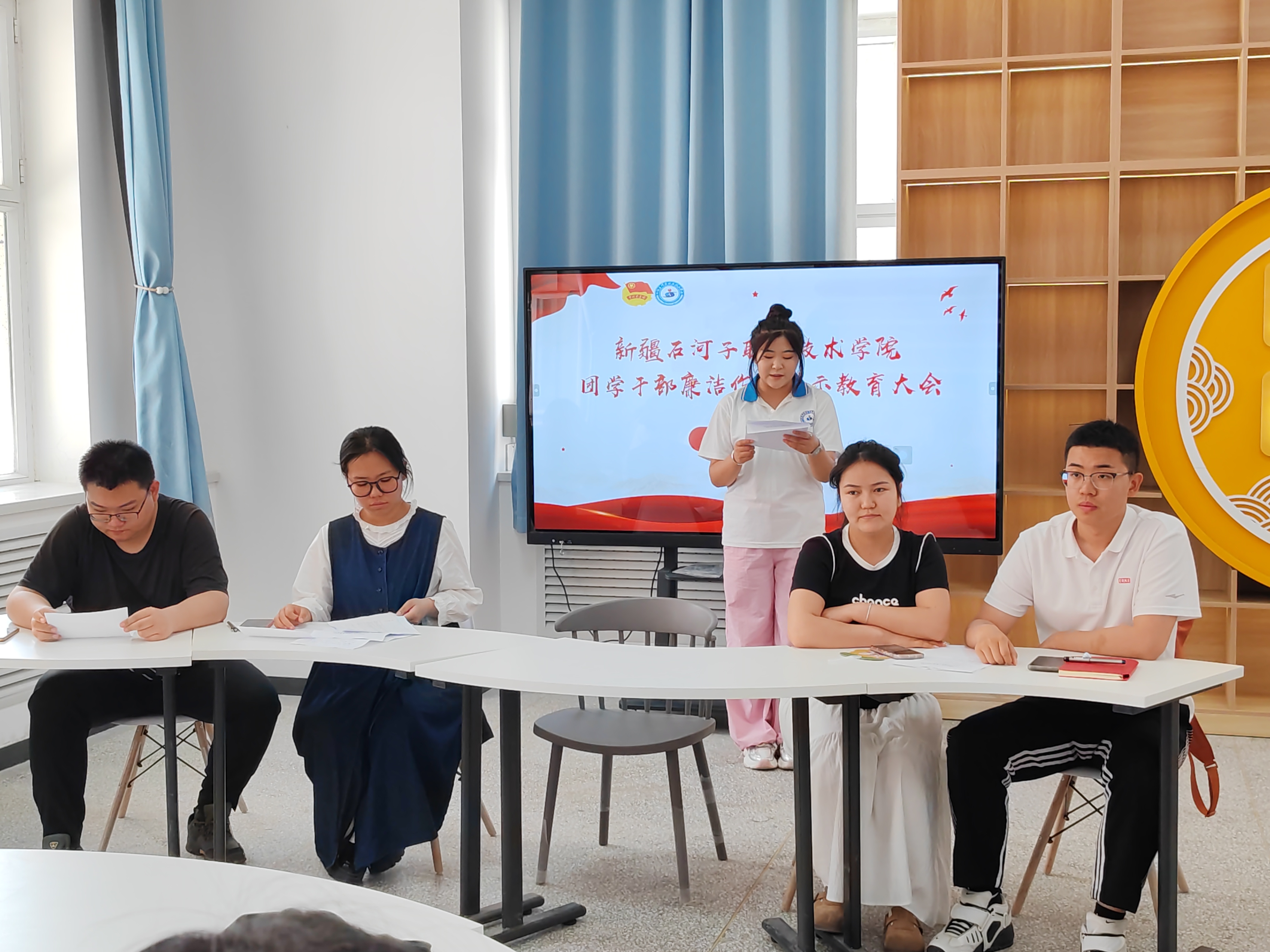 (努尔比耶·艾力 报道)为进一步加强学生干部队伍建设,提升学生干部队伍的政治觉悟,牢记服务宗旨,强化服务意识、纪律意识,不断改进工作作风,充分发挥学生干部的榜样引领作用。2024年5月23日上午,新疆石河子职业技术学院团委在知行社区润德工作站举办了一场针对团学领导团队的廉洁作风警示教育大会。本次大会由学院团委副书记黎丽主持,参会人员包括西部计划志愿者以及来自二级学院的30余名团学领导团队成员。