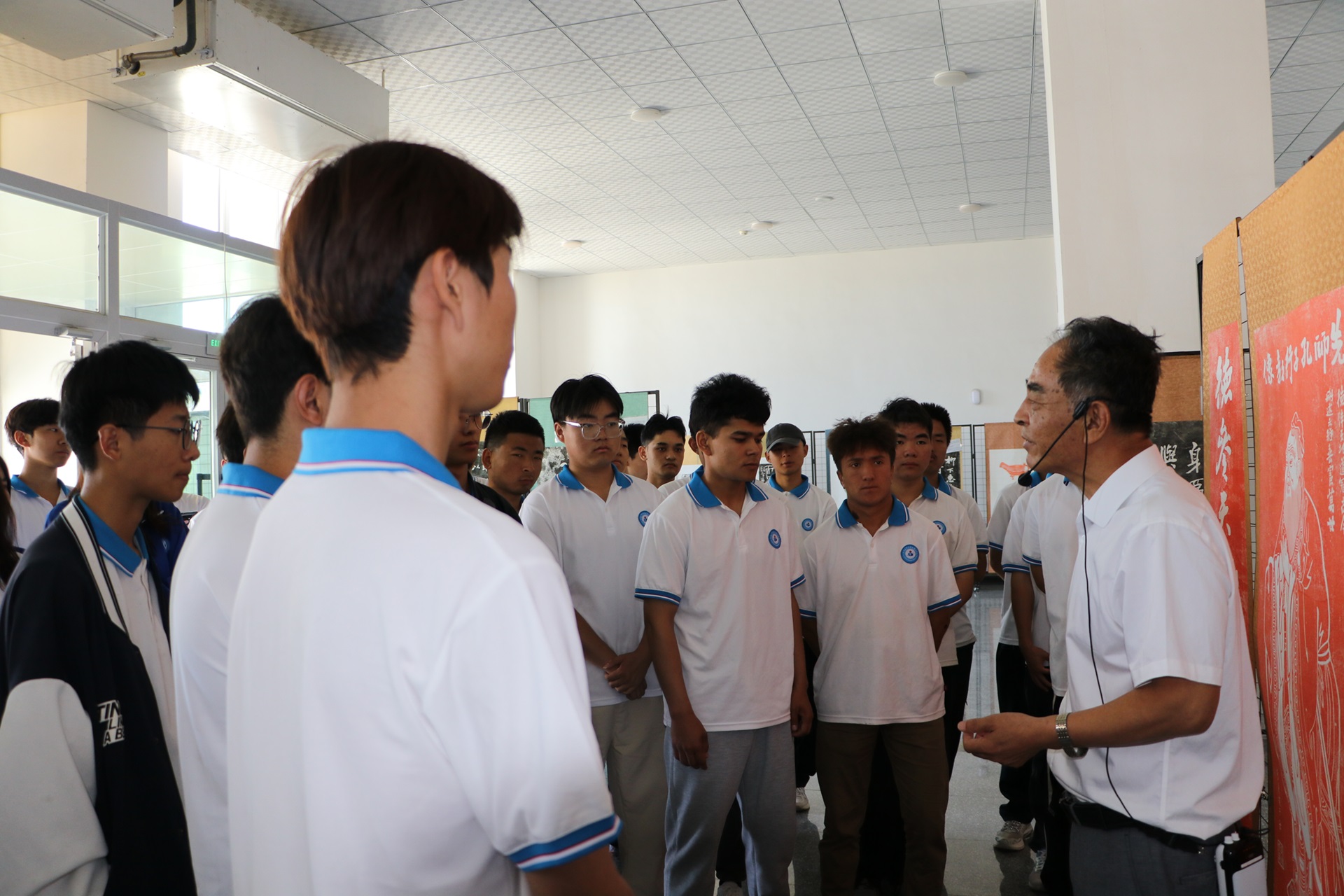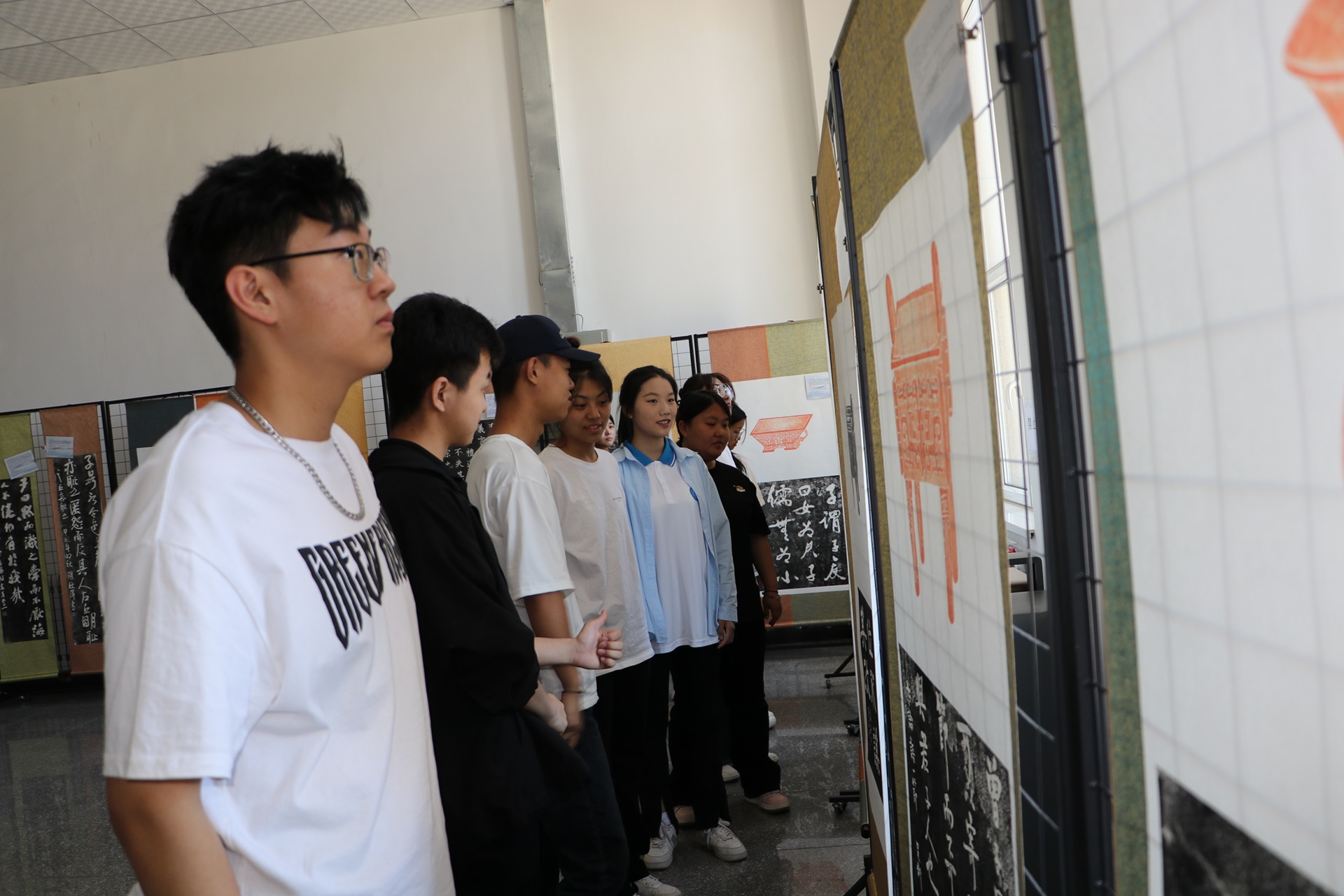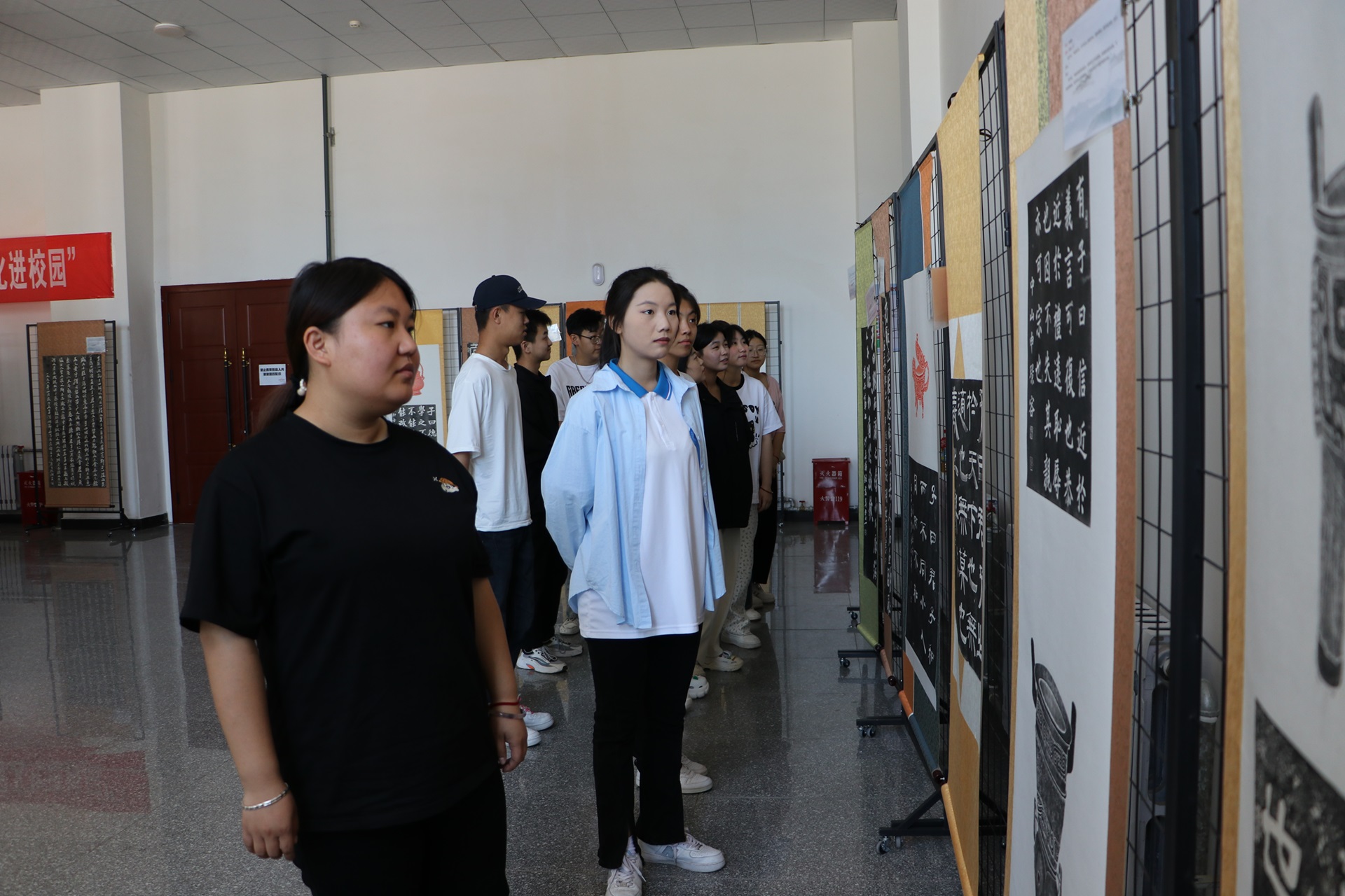 展览前,学院党委与活动主办方提前统筹协调、共同精心策划,积极组织学院相关部门进行场地布置、安全排查、参观流程指引等方面工作,确保展览顺利举行。展览现场,师生怀着对中国书法的崇敬与热爱之情有序进场,孔子研究院儒家文化传播中心碑拓作品馆馆长冯独步带领师生参观展厅内展出的碑拓作品,向参观师生悉心介绍作品中蕴含的儒家经典文化和精神,大家认真聆听冯馆长的讲解,了解到碑拓不仅要求技艺传承者具备高超的技艺和独特的审美,还要求传承者在继承中不断创新,以适应时代的发展。冯独步馆长表示,“拓片是中华优秀传统文化的重要载体,金石为骨,文脉为魂,在优秀碑刻的基础上,拓片承载着文化发展的重要使命,对于研究历史文献、文物、书画有着重要的研究价值,是历史发展的一个重要佐证”。师生们在作品前驻足欣赏、流连忘返。参观结束后,学生纷纷表示通过参观展览,提高了自己的眼界,加深了对中华优秀传统文化的认识。
