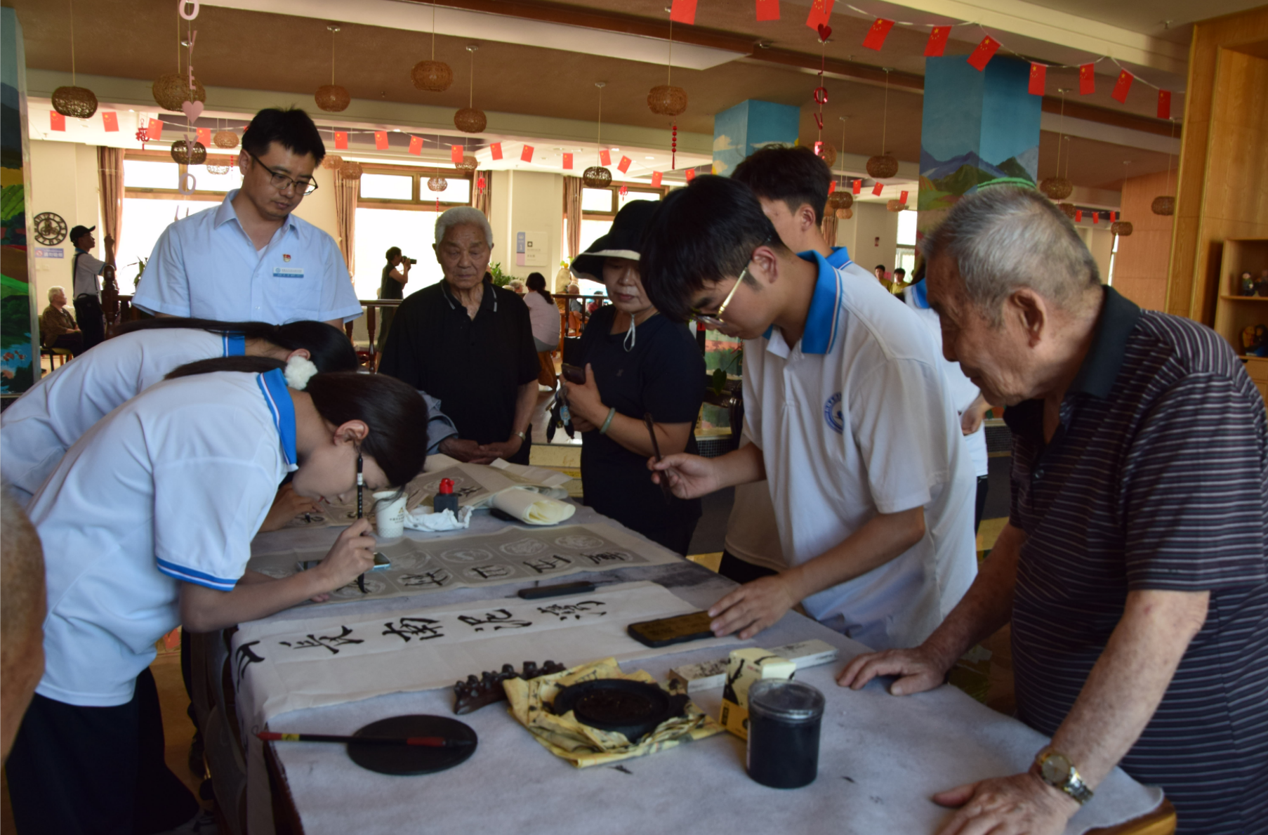 慰问活动在热烈的气氛中正式开始,学院教师们深情朗诵《依然年轻的城》,韵律优美动人,表达了对这座城市深深的眷恋和美好的期许;随后上演的原创情景剧《大漠无悔》生动地讲述了三代兵团人在天山南北的扎根历程,实现了在戈壁滩打造花园的梦想,触动了在场的老人们,仿佛时光倒流回到那个充满革命热情的年代,真切感受到了兵团精神和老兵的无悔情怀;接着,舞台上的《欢乐的跳吧》为观众带来了各族人民独有的热情奔放;最后,同学们与爷爷奶奶共同挥毫泼墨,展现了书法独特的魅力。在活动过程中,大家亲切交流,关心着老人们的身体和生活,让他们深切感受到了无比的温暖与关怀。