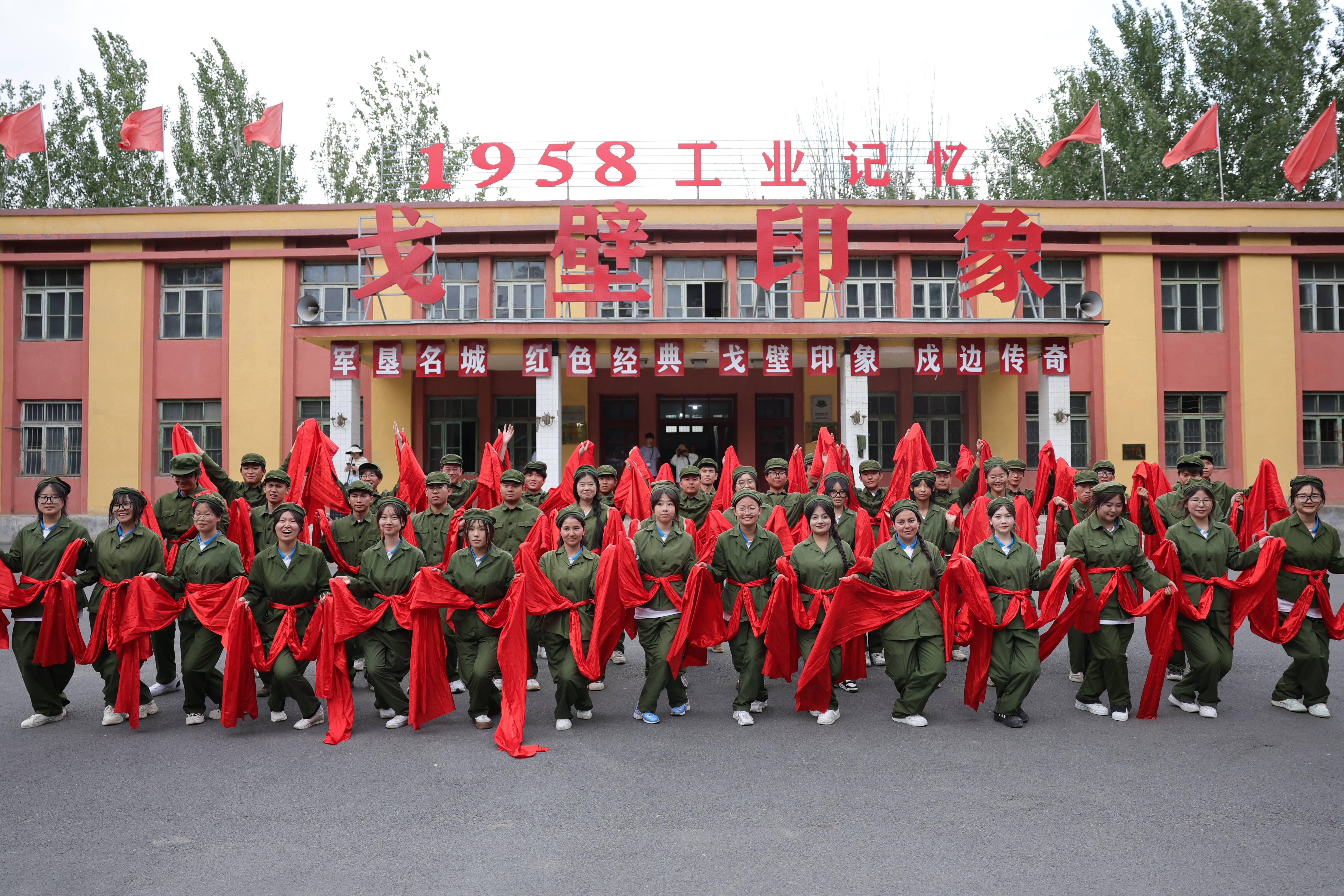 第三站新疆戈壁印象文化园——八一棉纺厂。在八一棉纺厂旧址,伴随着欢快、高昂的歌曲,师生们换上了六五式军装,扭起秧歌、跳起红舞,沉浸式体验老一辈军垦人激情燃烧的芳华岁月,感受兵团儿女对祖国的深情告白和无限热爱。师生参观“戈壁印象”八一工业记忆展陈馆,看着保存完好的一代、二代、三代织布机器设备,聆听着劳模的感人事迹,在深入领略老一辈兵团人如何以满腔热血和光辉青春创作出兵团史诗般壮丽篇章的过程中,窥见其坚定不移的意志与无私奉献的精神。