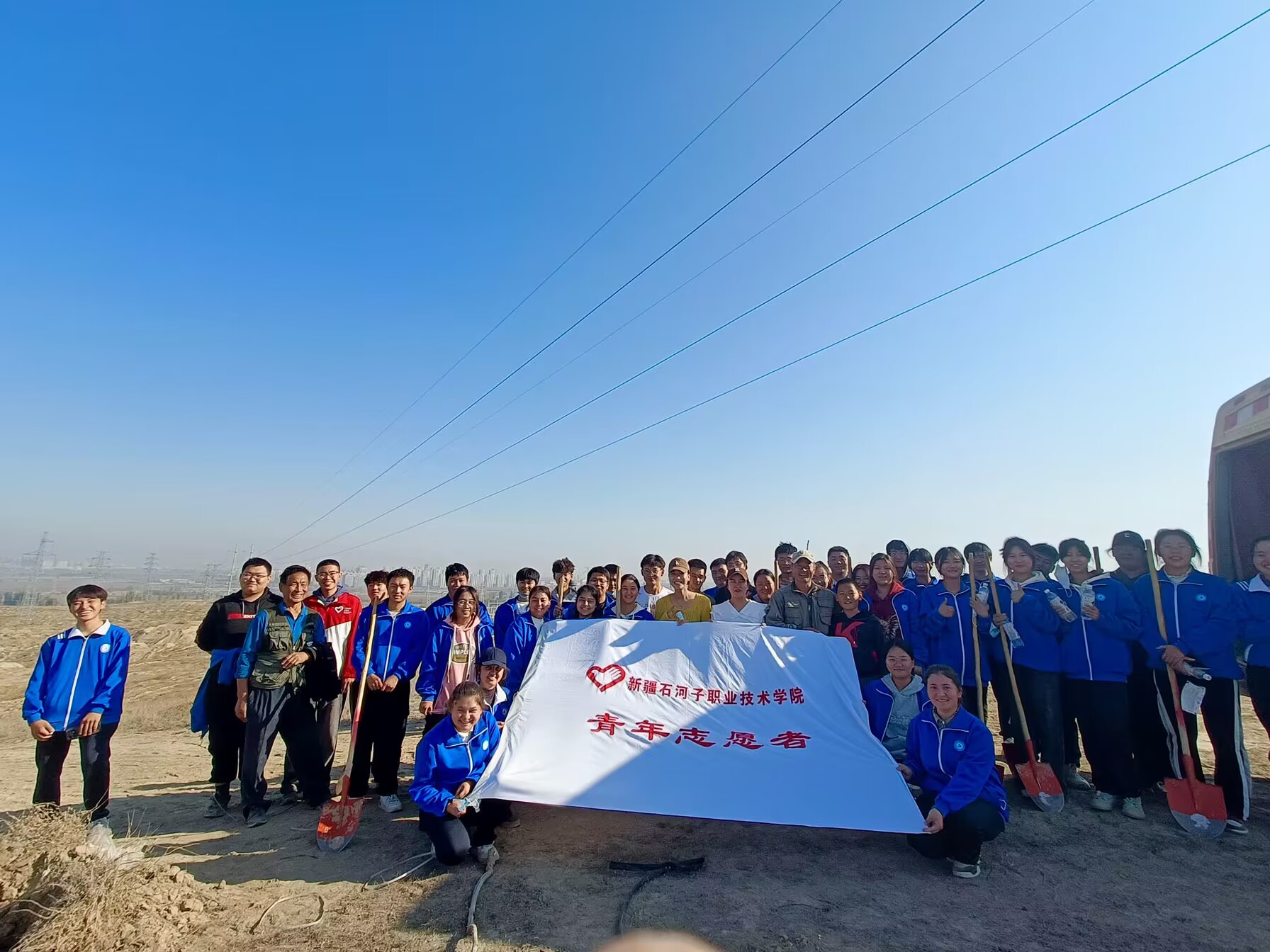 植树现场,团员青年们斗志昂扬、干劲十足,三三两两各成一组,分散有序开展植树活动。有的挥锹铲土,有的扶苗踩实,栽得认真、干得卖力,一丝不苟地完成每一道工序,精心栽下每一棵树苗,200余棵新载苗木在蓝天下迎风挺立,展现着蓬勃的生机活力,使大家在享受着公益劳动快乐的同时,也为生态文明添上一簇簇新绿。