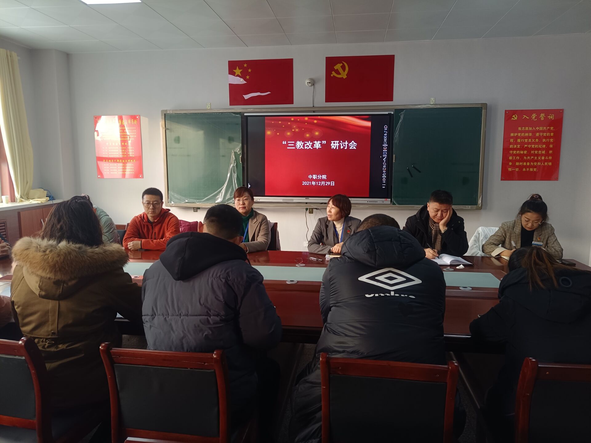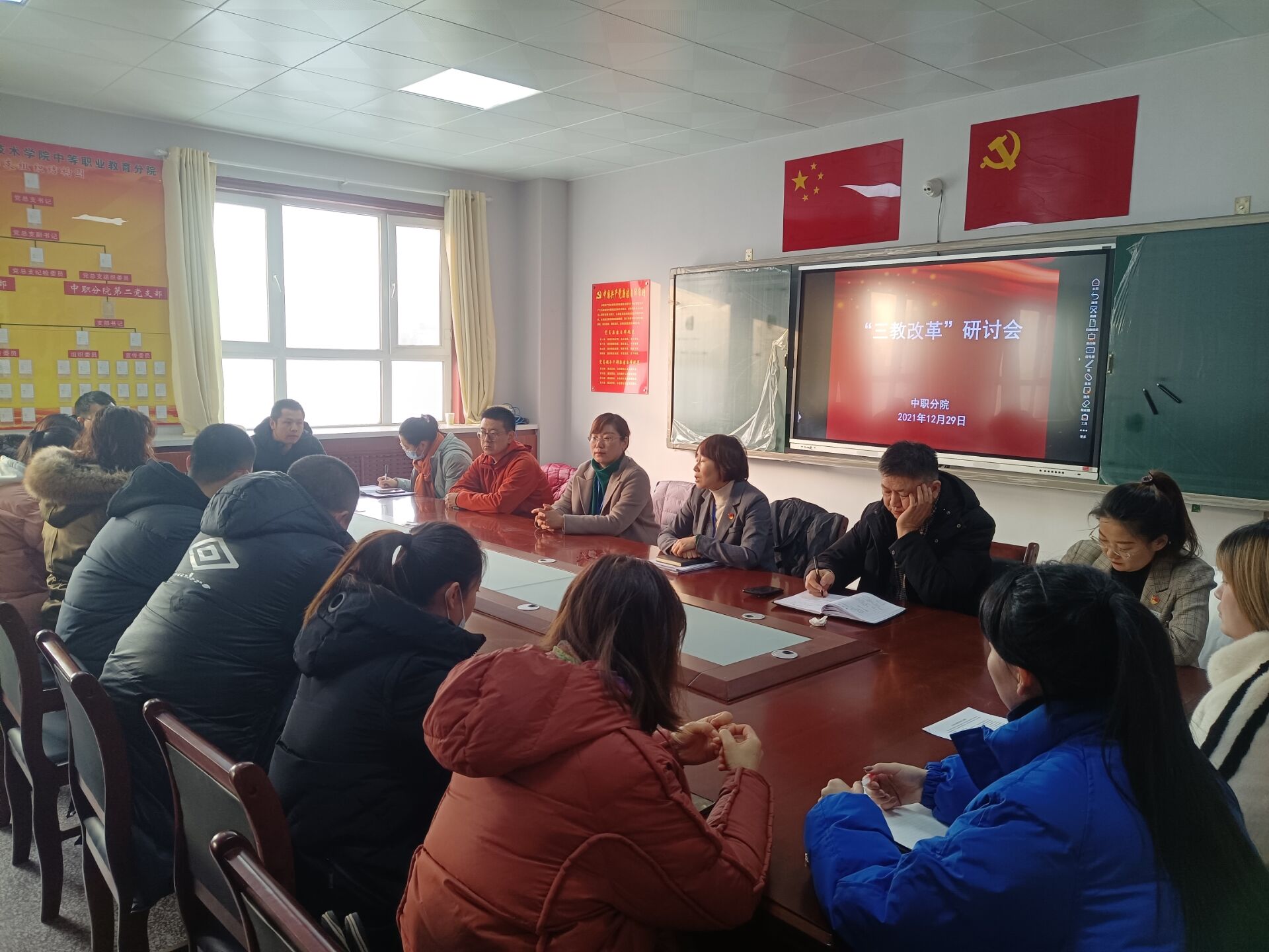 (苗梦雪报道)兵团职校,以研探寻工匠之根本;星火传聚,用教培栽桃李之天下。12月29日,中职分院召开“三教”改革研讨会,会议由分院院长吴晓晖主持,分院党总支书记张海芸、副院长曹英军、助理丁雷、教务处教师王丽、尹升鹏、王宇及分院教办、各教研室主任、学科带头人、骨干教师参加会议。会议主要围绕“三教”改革专题进行,以专业为基础,从课程体系调整、人才培养模式创新到教师指导实习实训能力的提高,老师们展开了充分的研讨。分院确定中职教学以“固基础、提质量”为指导思想,公共基础课学习要基于类型人才的培养标准,为高职继续培养奠定坚实基础。专业建设中以创新人才培养模式为突破,达到提高学生通用职业素质的目标。调整课程体系,将文化课抽考、技能测试、1+X证书考试等内容融入日常教学,实现课、赛、岗、证融通。同时结合高职专业提出公共课改革建议:部分专业可开设大学语文,数学侧重不同的知识点,英语尝试分层授课,体育按项目教学等等。通过研讨引导教师把“三教”改革工作融入日常教育工作之中,在研究与改革中谋求教学新变化,为职业教育拓宽新思路。