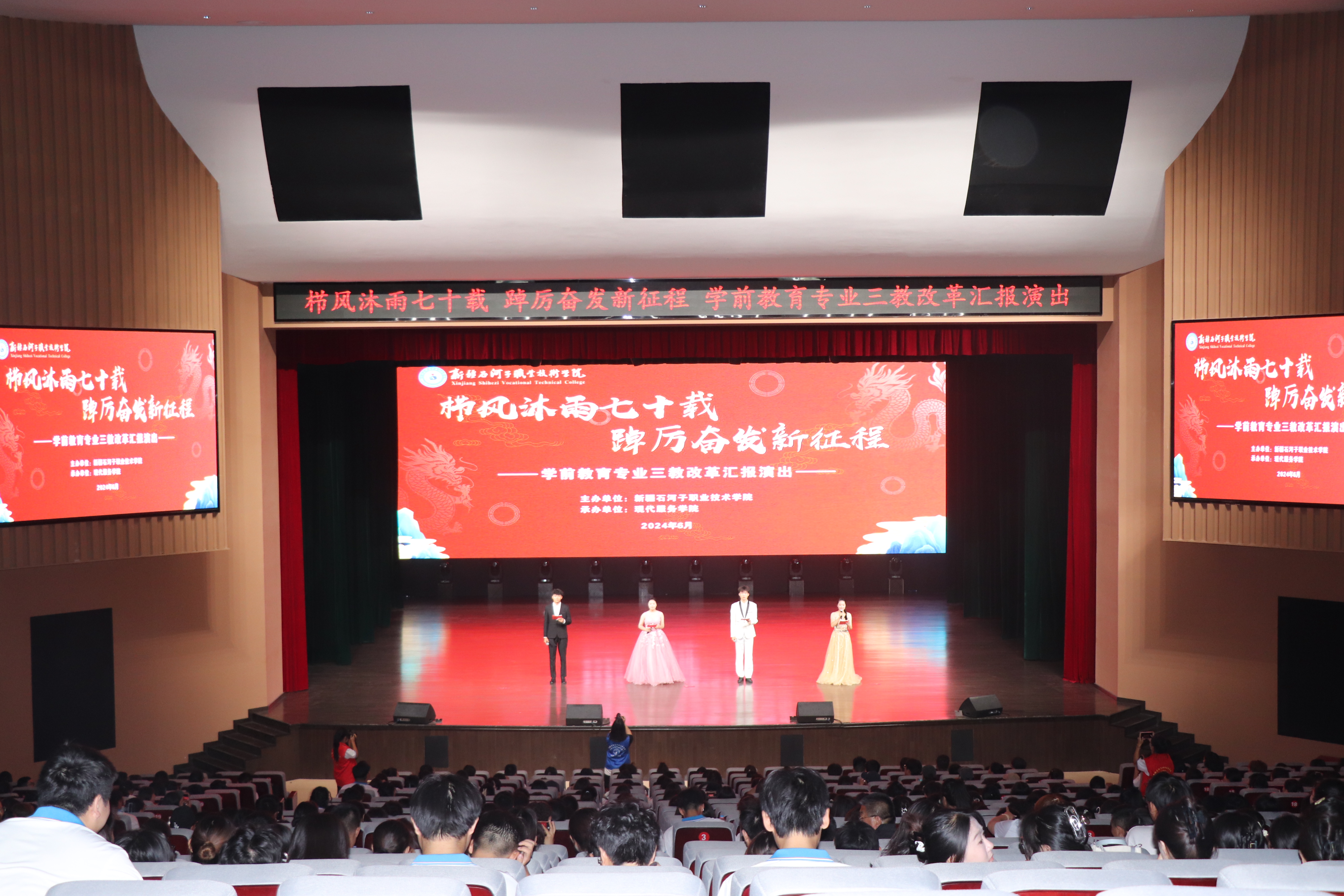 (蒋小玉 谢雨昕 报道)为进一步落实党的教育方针和立德树人根本任务,展示学前教育专业“三教”改革成果,向“七一”献礼,向兵团成立70周年献礼,2024年6月27日,现代服务学院举办了“栉风沐雨七十载 踔厉奋发新征程”学前教育专业三教改革汇报展演。学院纪委书记万祥军、学院机关处室负责人及现代服务学院全体师生参加本次活动。