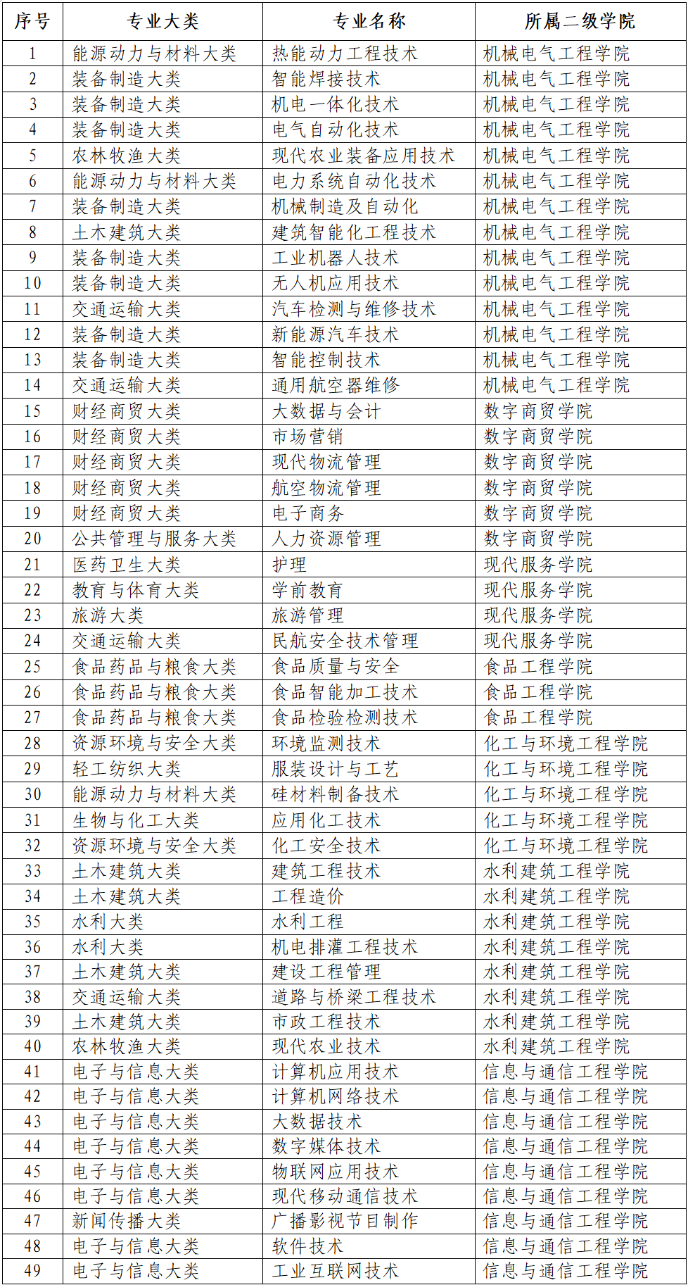 国家示范院校建设重点专业专业2个:机电排灌工程技术、食品智能加工技术;第一批国家现代学徒制试点建设专业2个:现代农业装备应用技术、热能动力工程技术;提升产业服务能力国家级重点专业1个:建筑工程技术;省级现代学徒制试点建设专业2个:食品检验检测技术、建筑工程技术;省级重点专业2个:电气自动化技术、应用化工技术。