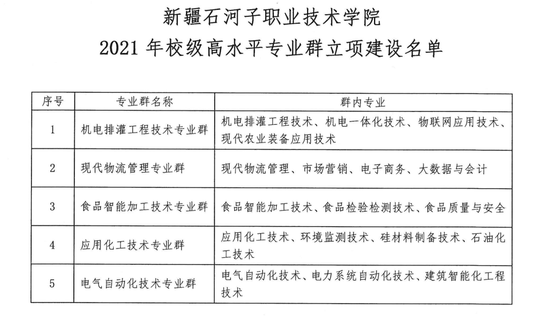 目前,学校内共有校级专业群6个,其中,食品智能加工技术专业群包含食品智能加工技术、食品检验检测技术、食品质量与安全3个专业;应用化工技术专业群包含应用化工技术、硅材料制备技术、环境监测技术、石油化工技术4个专业;电气自动化技术专业群包含电气自动化技术、电力系统自动化技术、建筑智能化工程技术3个专业;建筑工程技术包含建筑工程技术、建设工程管理、工程造价、市政工程技术、道路与桥梁工程技术5个专业;大数据技术专业群包含大数据技术、计算机应用技术、数字媒体技术、软件技术4个专业;机械制造及自动化专业群包含机械制造及自动化、工业机器人技术、智能焊接技术3个专业。