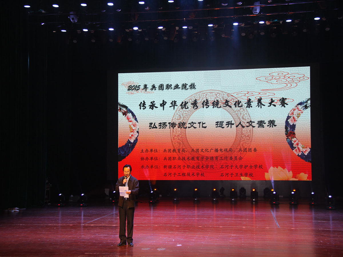 10月28日晚,由兵团教育局、文化广播电视局、团委联合主办,学院承办的兵团职业院校传承中华优秀传统文化素养大赛颁奖典礼暨优秀作品展演活动在石河子市青少年宫隆重举行。兵团教育局副局长刘景峰、职成处处长周锦瑶、机关党工委张国强处长及各师教育局领导出席典礼并为获奖选手颁发奖状。