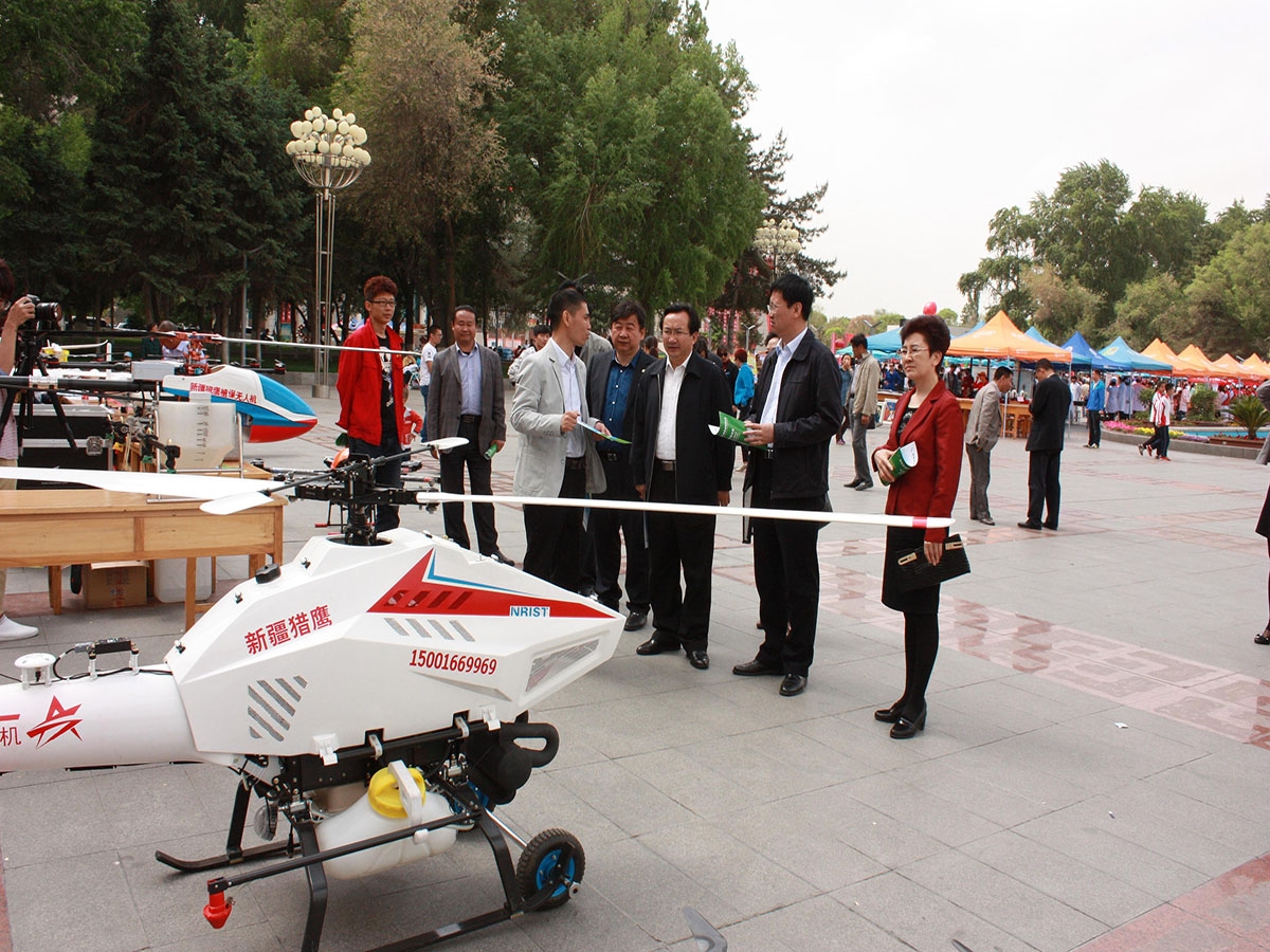 图为兵团、八师领导在无人机展台前听介绍
