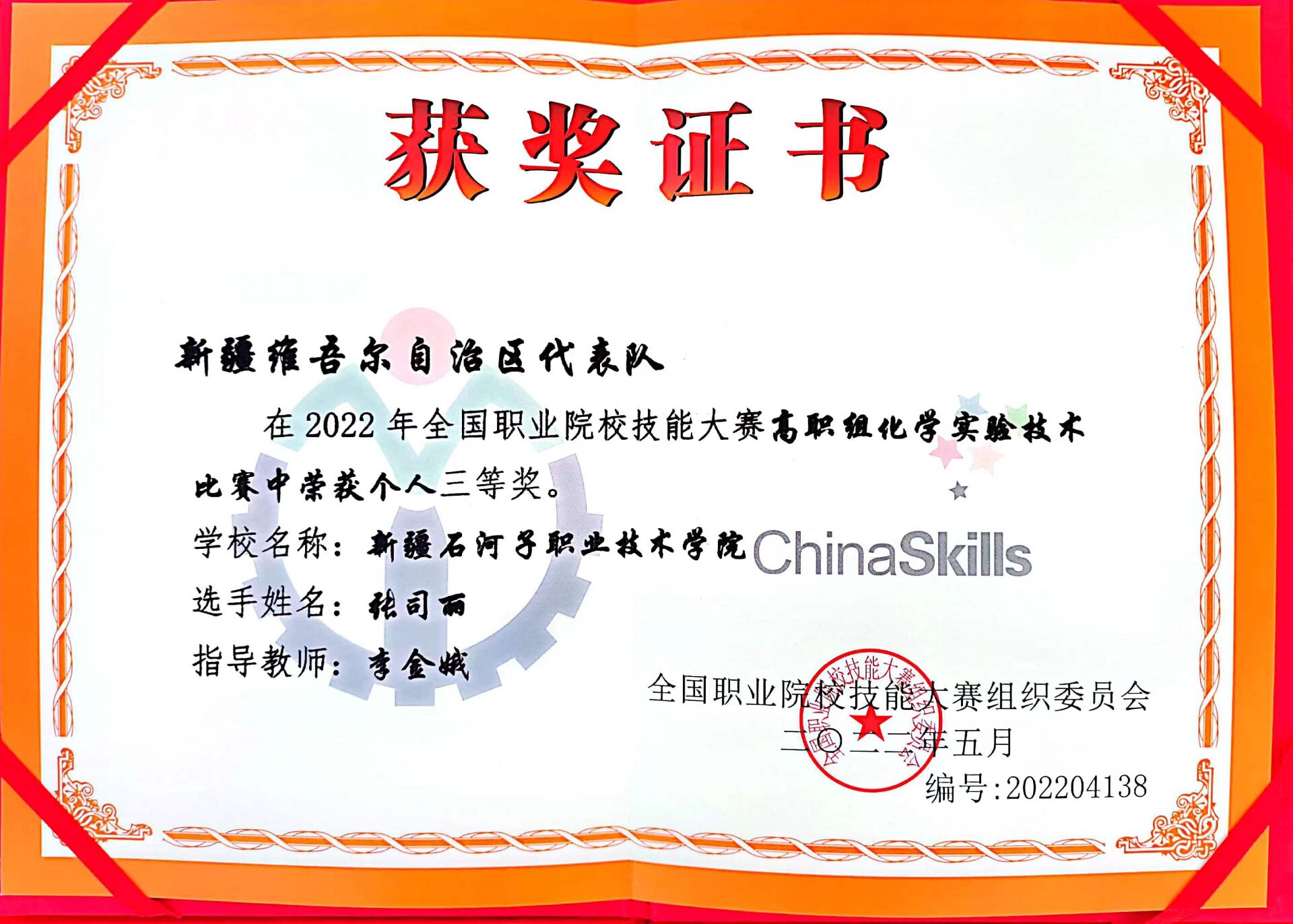 Beat365中文官方网站轻纺化工分院的张司丽同学代表学院参赛,在两天的激烈角逐中,她沉着面对,表现出色,从56支队伍中脱颖而出,最终夺得个人三等奖的好成绩,实现了新疆在该赛项国赛上零的突破,也为学院在2022年全国职业院校技能大赛的角逐中再添一枚奖牌。学院党委高度重视参赛工作,要求指导教师紧扣本次比赛赛项规程和要求,为参赛选手制定备赛计划并严格训练。从3月份开始备战一直到8月比赛,分院领导全程督战,指导老师李金娥全程陪赛,做好学生训练和比赛期间的保障工作。