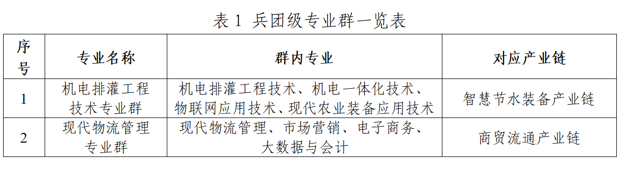 目前,学校有兵团级专业群2个,其中,机电排灌工程技术专业群包含机电排灌工程技术、机电一体化技术、物联网应用技术、现代农业装备应用技术4个专业;现代物流管理专业群包含现代物流管理、市场营销、电子商务、大数据与会计4个专业。