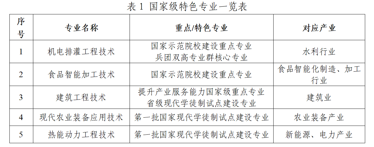 目前,学校有国家级特色专业5个,其中,国家示范院校建设重点专业2个:机电排灌工程技术、食品智能加工技术;第一批国家现代学徒制试点建设专业2个:现代农业装备应用技术、热能动力工程技术;提升产业服务能力国家级重点专业1个:建筑工程技术。