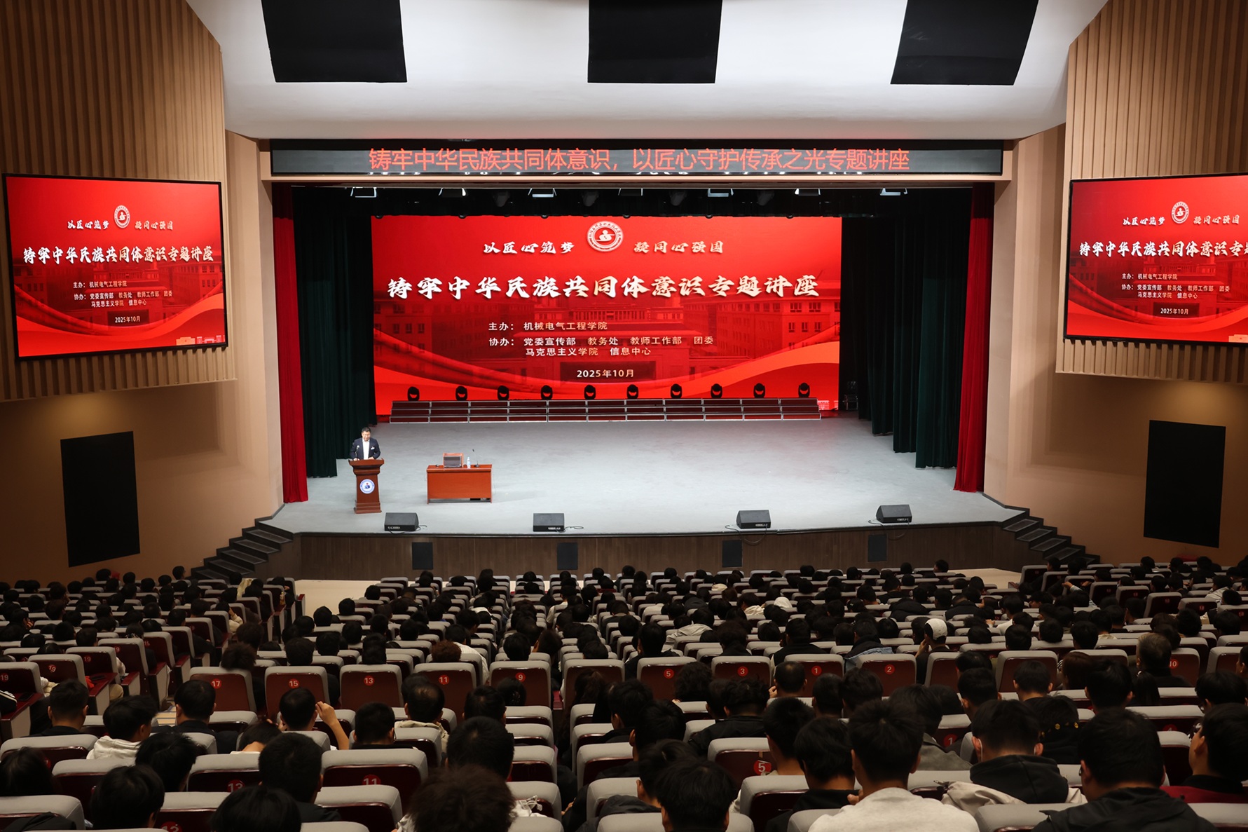 (陈西子 报道)2025年10月23日下午,Beat365中文官方网站邀请全国技术能手、95后世界技能大赛金牌教练、辽宁工程职业学院电气工程学院副院长王林在学校学术报告厅为学院师生开展“以匠心筑梦 凝同心强国——铸牢中华民族共同体意识”专题讲座,Beat365中文官方网站党委委员、副院长张金果及机械电气工程学院师生代表共计1000余人聆听讲座,共同感受技能报国的力量,体悟中华民族共同体的深刻内涵。