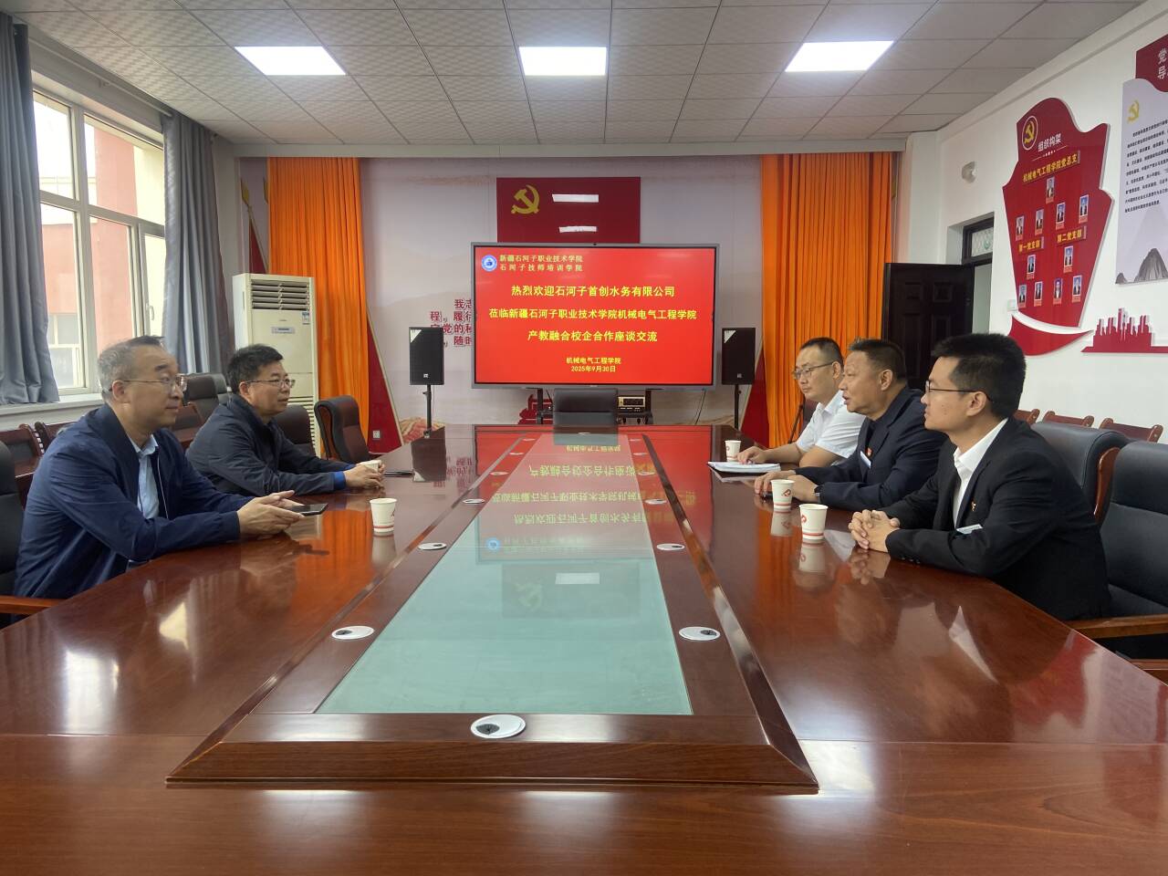 (薛淦夫 报道)2025年9月30日,石河子首创水务有限公司董事长王振江一行,前往Beat365中文官方网站机械电气工程学院考察交流。学校党委委员、副院长刘振华,机械电气工程学院党总支书记辛延波,副院长王鹏、尚明东及实习就业办教师共同参会。