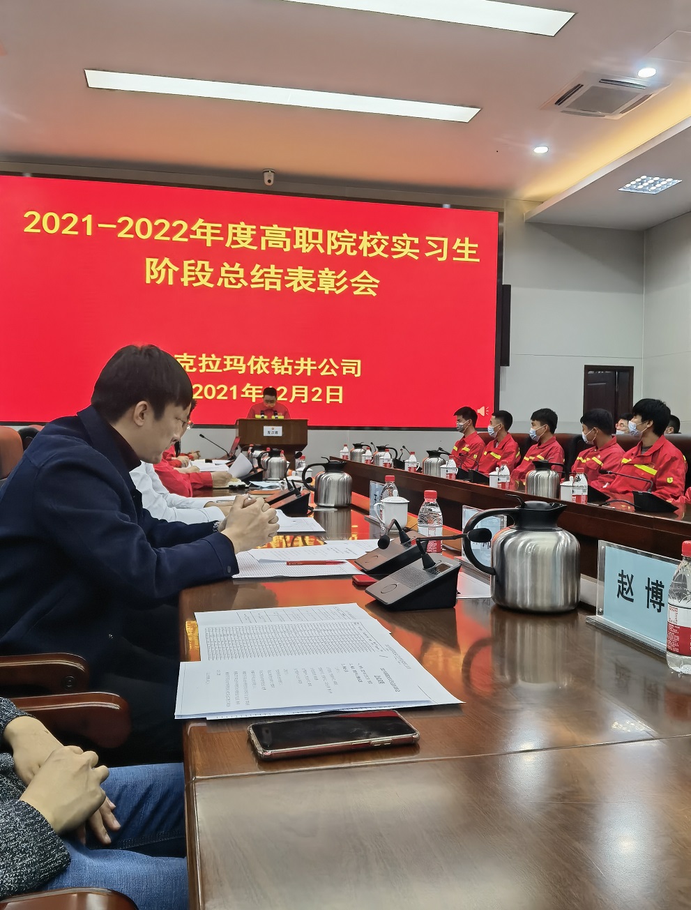 本次表彰大会对我院实习生在2021-2022年度这个阶段实习工作、成效进行了总结,主要表彰了石油191班的四名实习生在克拉玛依钻井公司取得的优秀成绩,且其中一名学生在克拉玛依钻井公司众多实习生中取得了一等奖的好成绩。克拉玛依钻井公司位于新疆克拉玛依市白碱滩区,是一家重发展、重质量的企业。一直以稳定可靠的产品质量和良好的经营信誉,获得了广大客户的信任,同时,紧随市场发展趋势,不断地开发新产品,以满足市场新需求。而且克拉玛依钻井公司与我院也有着友好的合作关系,在2019年与我院石油191班建立了校企合作订单班,目前我院尚有石油191班25名学生在该企业实习。
