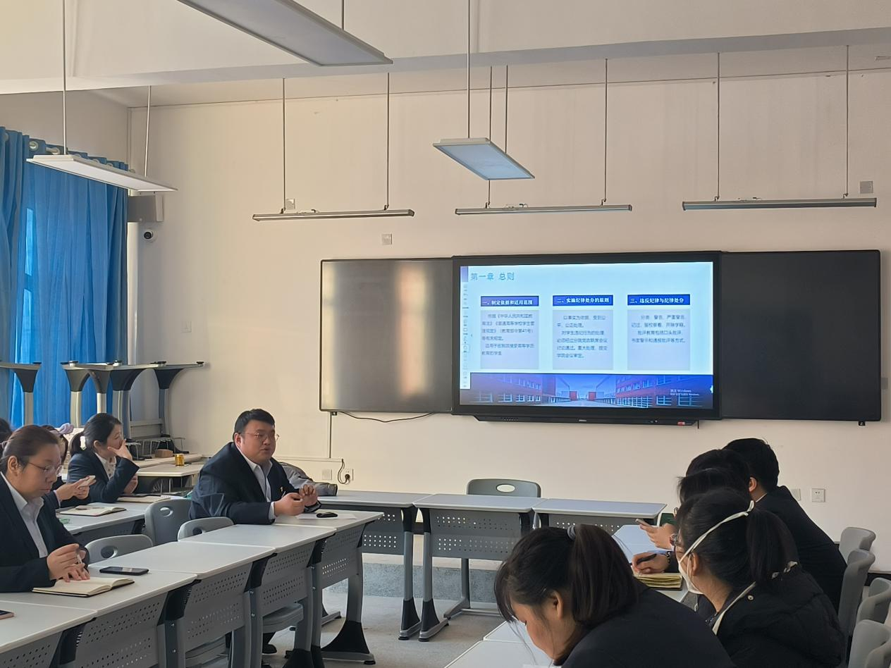 2月27日分院邀请了学生处杨徐飞副处长为分院全体班主任老师解读学院《学生纪律处分管理办法(试行)》,杨处主要从实施纪律处分的原则、违反纪律与纪律处分、纪律处分运用规则、对违法犯罪或者违反《治安管理处罚法》的学生的纪律处分、扰乱社会秩序类行为、侵犯公民权利和经济类行为、违反社会主义道德类行为、扰乱公共管理秩序类行为、严重失信行为等多个方面展开培训,结合自己的学生管理经验,由浅入深,运用日常案例进行分析讲解,让班主任老师对违纪处分的标准有了清晰的认识。此次培训有效的指导班主任老师在班级管理过程中较好的运用该管理办法,保障学生合法权益,营造良好学习氛围。
