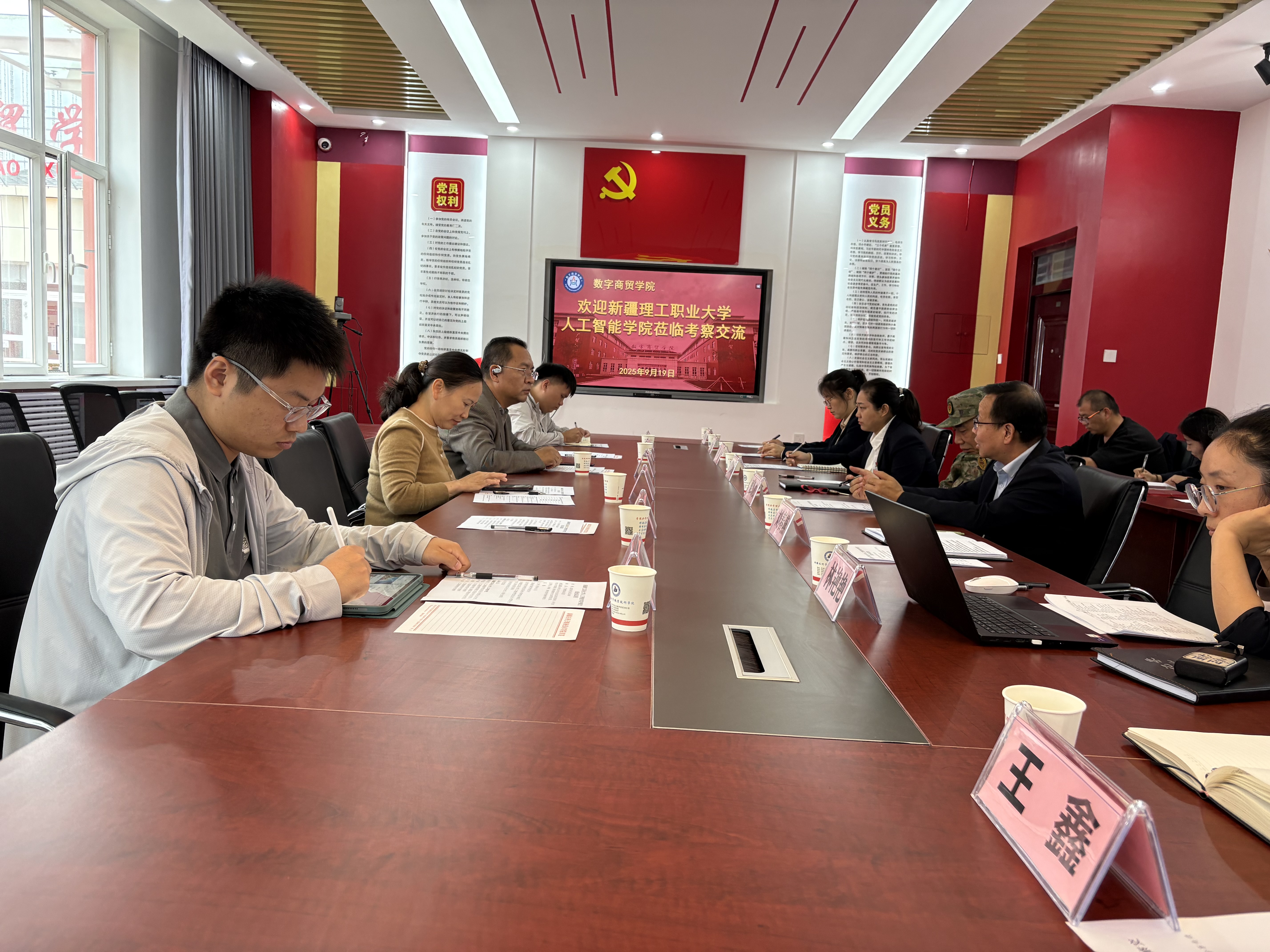(刘春燕 胡荣报道)为深化职业教育校际协作,共同探索专业办学与行业动态深度适配的有效路径,2025年9月19日下午,新疆理工职业大学人工智能学院周向虎、李灵佳、钟梅等6位教师代表,专程赴我校数字商贸学院开展专业建设与人才培养交流研讨活动。数字商贸学院党支部书记党博文、院长栗劲松及学院各专业负责人出席会议,会议由学院副院长刘群麾主持。