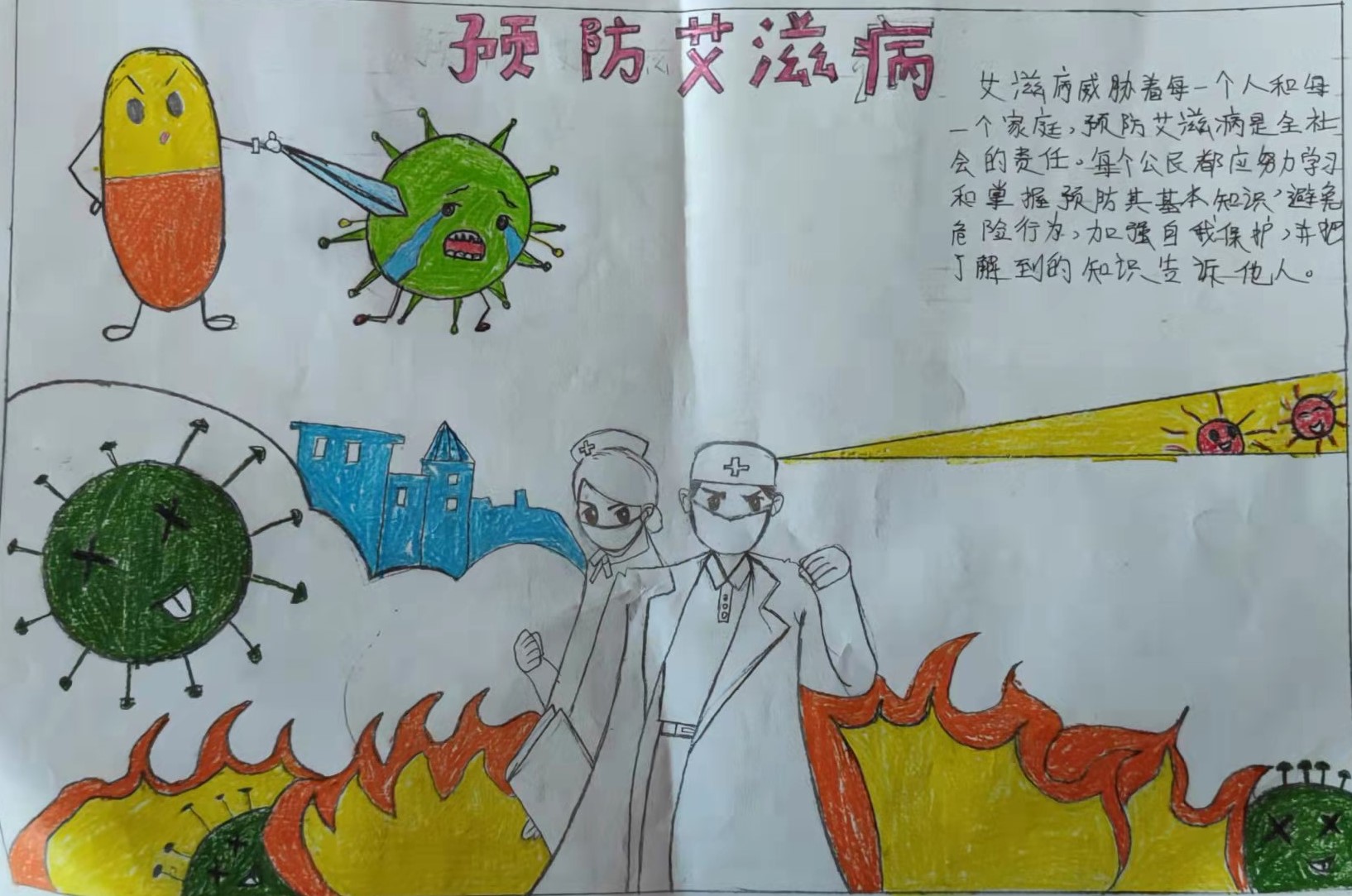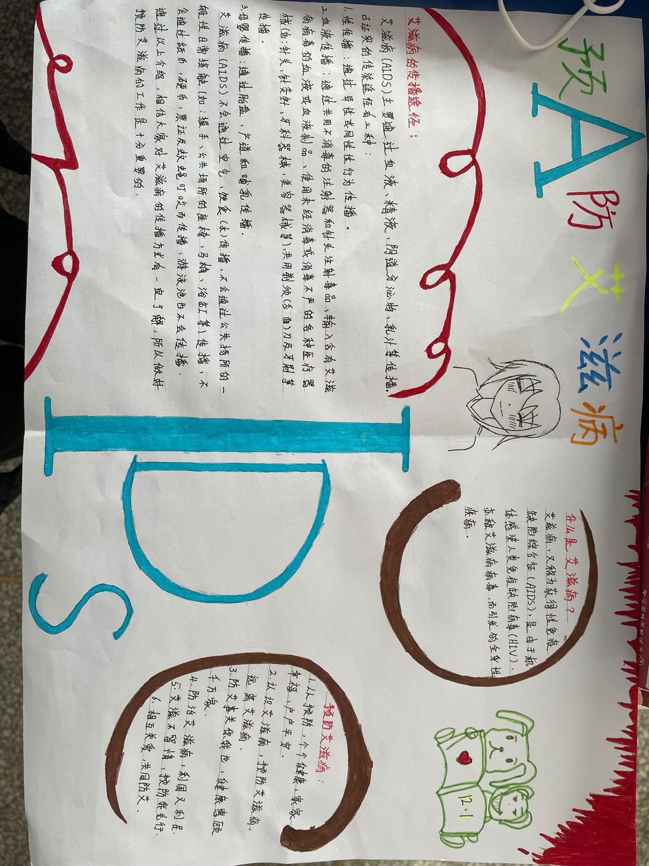 活动共收集关于“世界艾滋病日”征文40余份。在这40余份征文中由3名同学的征文作品脱颖而出,分别获一、二、三等奖。在以班级为单位开展的“预防艾滋病”为主题的手抄报比赛中,同学们以手中的画笔描绘出了自己所熟知的“防艾”小知识,和自己对于“艾滋”的理解与认识,手抄报以图画的形式在富有趣味性的同时也提高了同学们对于“艾滋”的认识与理解。同学们制做的微视频《以爱之名,为“艾”发声》、《艾滋无声,防艾有情》、《预防艾滋病,从我做起》等作品主题突出寓意鲜明,分别获得此次活动的前三名。
