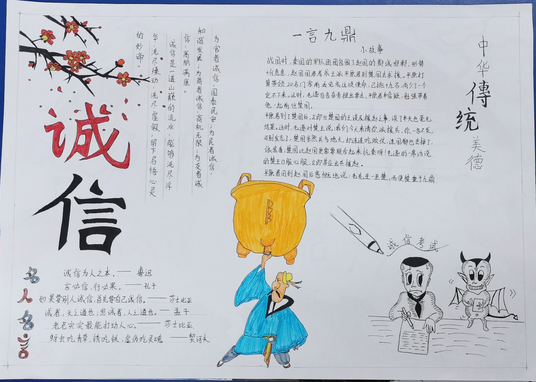 6月13日,各班级分别上交了以“诚信教育”为主题的优秀手抄报和征文,征文和手抄报的内容都围绕着“诚信教育”展开,以生动形象的人物形象刻画出的手抄报和通俗易懂的语言书写的征文都只为了表达自己对“诚信”的理解。