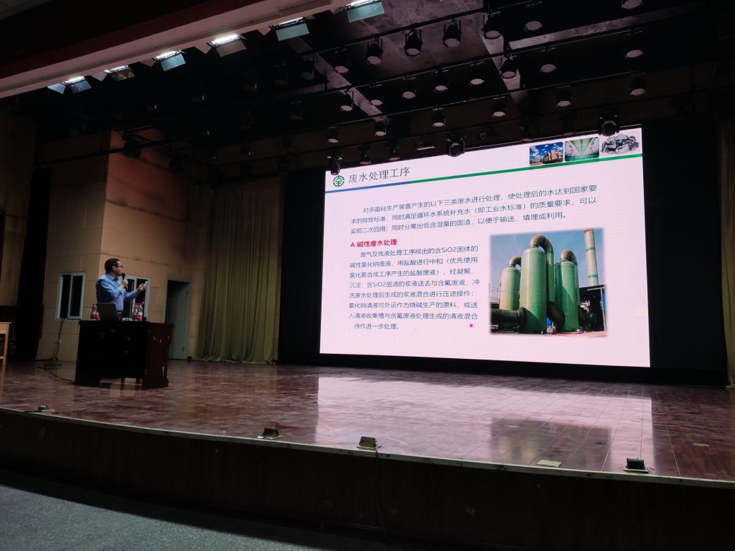 研讨交流会上,与会双方共同交流探讨了企业和高校共同科研、联合申请课题等内容。讲座上,校企双方领导分别为参加“全国职业院校现代化HSE科普知识竞赛校内预选赛”获奖的同学颁发奖状。随后,王总从我国环保政策和国际形势大背景下,介绍了多晶硅行业发展史和多晶硅工艺的发展。王总生动精彩的讲座,赢得了老师和同学们阵阵掌声,激发了学生学习专业知识的兴趣,也为同学了解大全能源提供了机会,最后他还就学生关心话题与同学们进行了互动,现场气氛热烈。