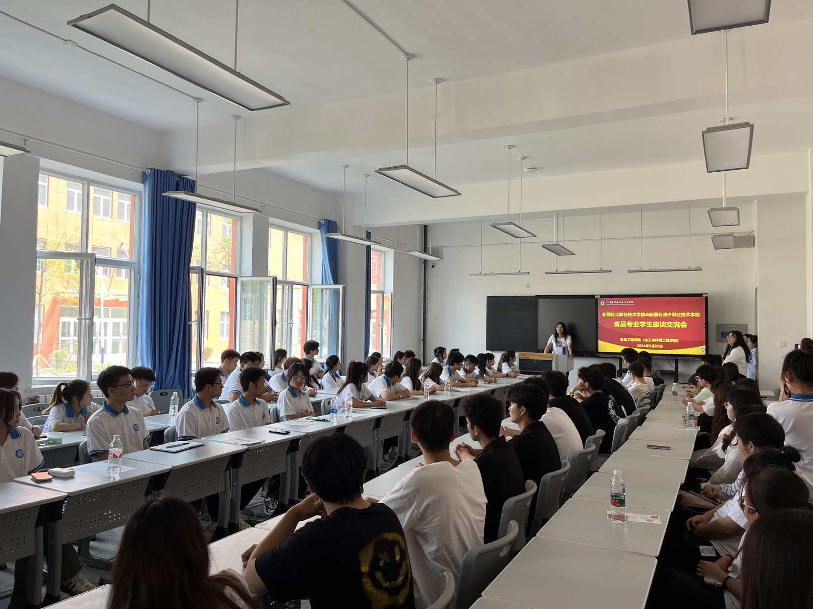 座谈会上,李晓华书记对学院发展历程、学科建设、平台建设、科研进展、学生培养及近年来取得成果等情况作了详细介绍。马金才书记围绕新疆轻工职业技术学院食品分院专业目标定位、课程体系构建、教学模式改革、师资队伍建设、健全规章制度等方面展开交流,并表示希望两校能够加大合作力度,发挥各自的优势资源,共同发展。与会双方就教学科研、学生管理及思想政治教育、各类名师工作室建设、产教融合校企合作等方面进行深入交流探讨,专业教师针对专业建设问题展开讨论。学生座谈在鸿志楼A106教室展开,双方学生管理教师及80余名两校学生代表以“交流互鉴 共谋发展”为主题,就学生会机构设置、学生干部队伍建设、团学活动、创新创业大赛、专业技能大赛等方面进行交流分享。