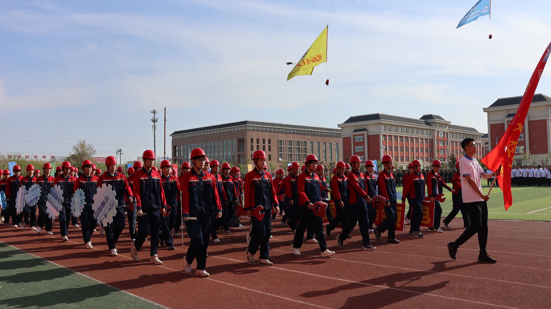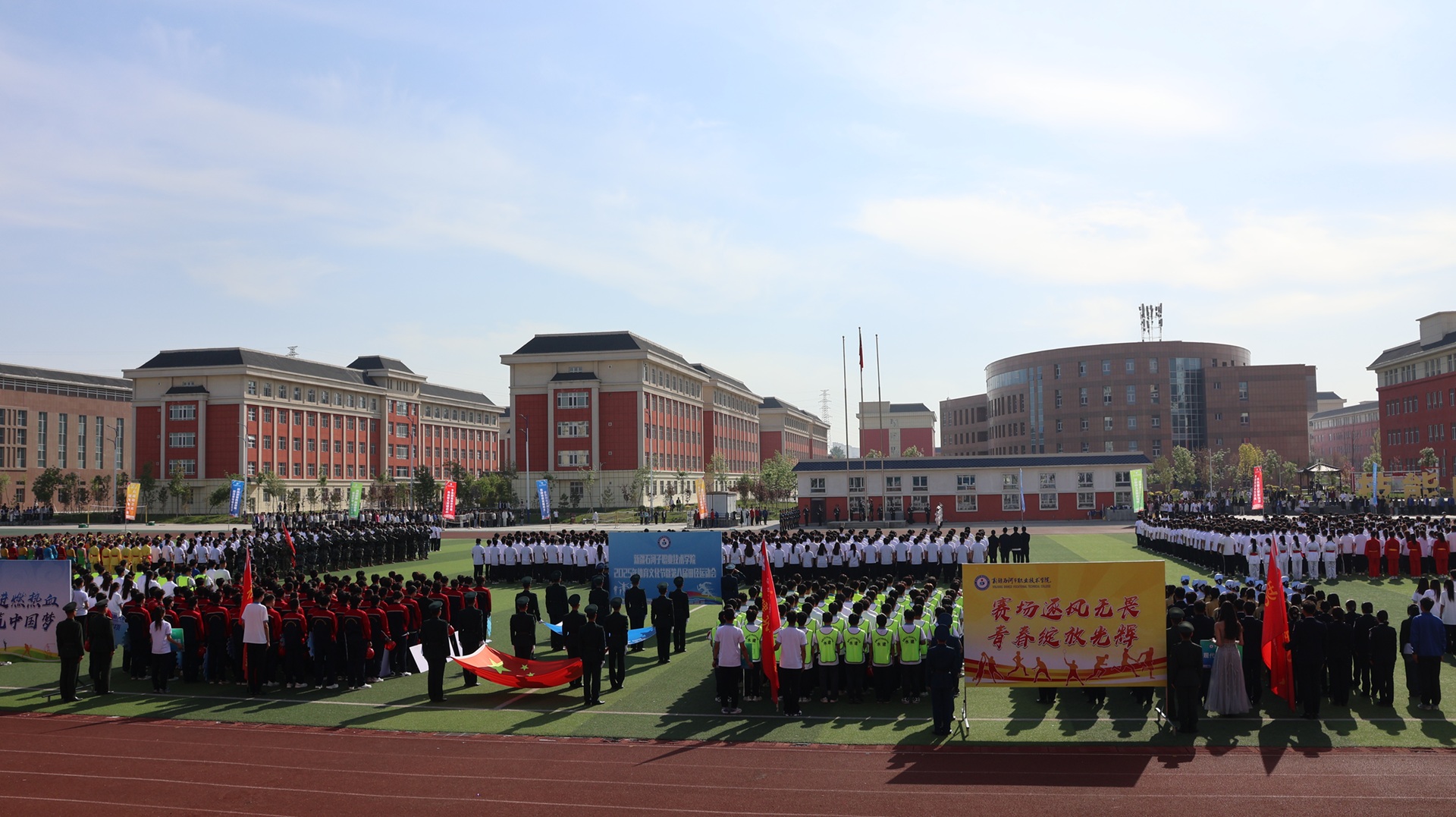 各二级学院联袂呈现了一场精彩绝伦的团体操展演。信息与通信工程学院的舞龙表演《龙狮腾跃 操舞飞扬》震撼开场,为观众带来了一场视觉与艺术的盛宴。现代服务学院《美丽中国》民族舞中,表演者身着民族特色服饰翩然起舞,充分展现传统文化的博大与魅力。数字商贸学院、水利建筑工程学院等四个学院联合编排的武术表演《武韵华章》通过武术招式与舞蹈刚柔并济的结合,彰显中华武术的独特魅力。军士学院《利刃出鞘 决胜沙场》以实战化刺杀操和战术动作表演点燃全场,彰显“携笔从戎、强军报国”的青春担当。机械电气工程学院《少年当燃·智造疆来》演绎了青年学子以科技赋能边疆发展的壮阔图景。