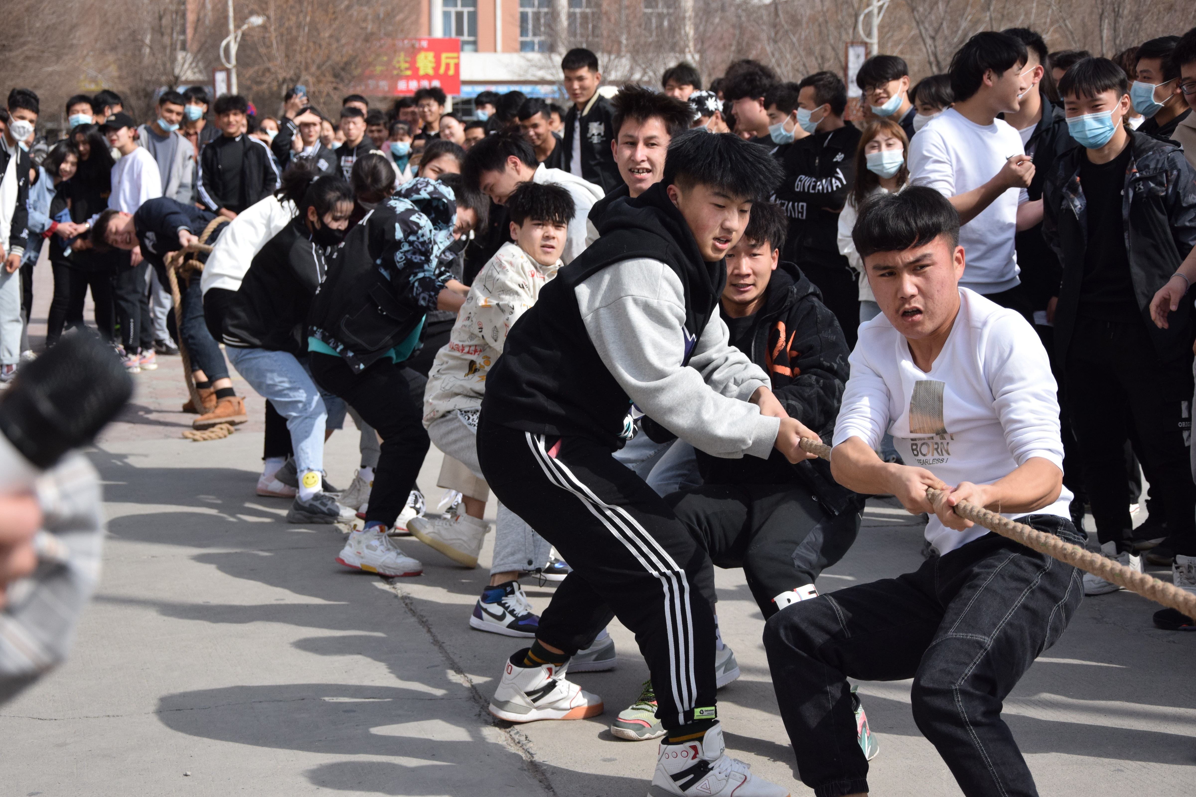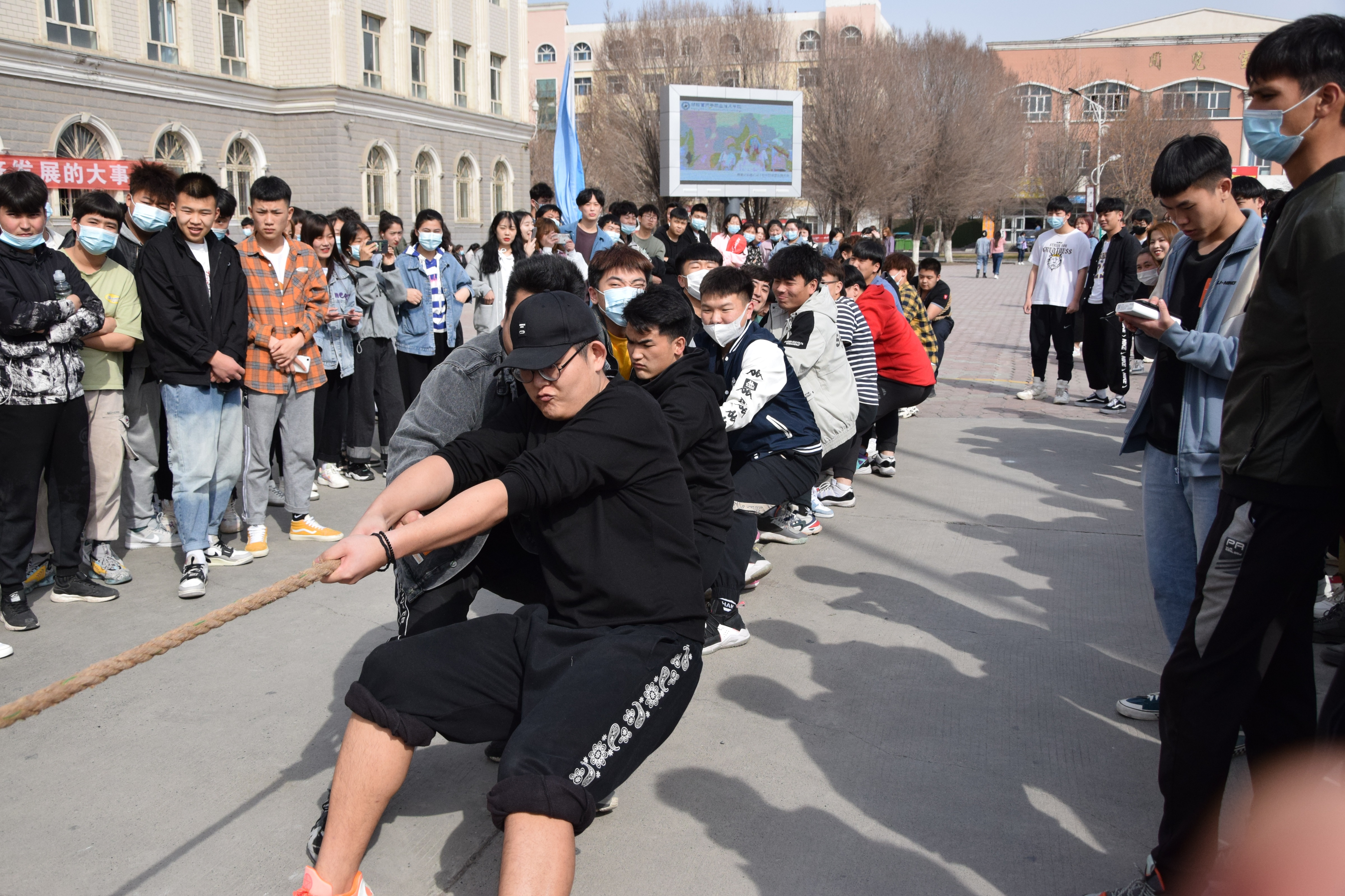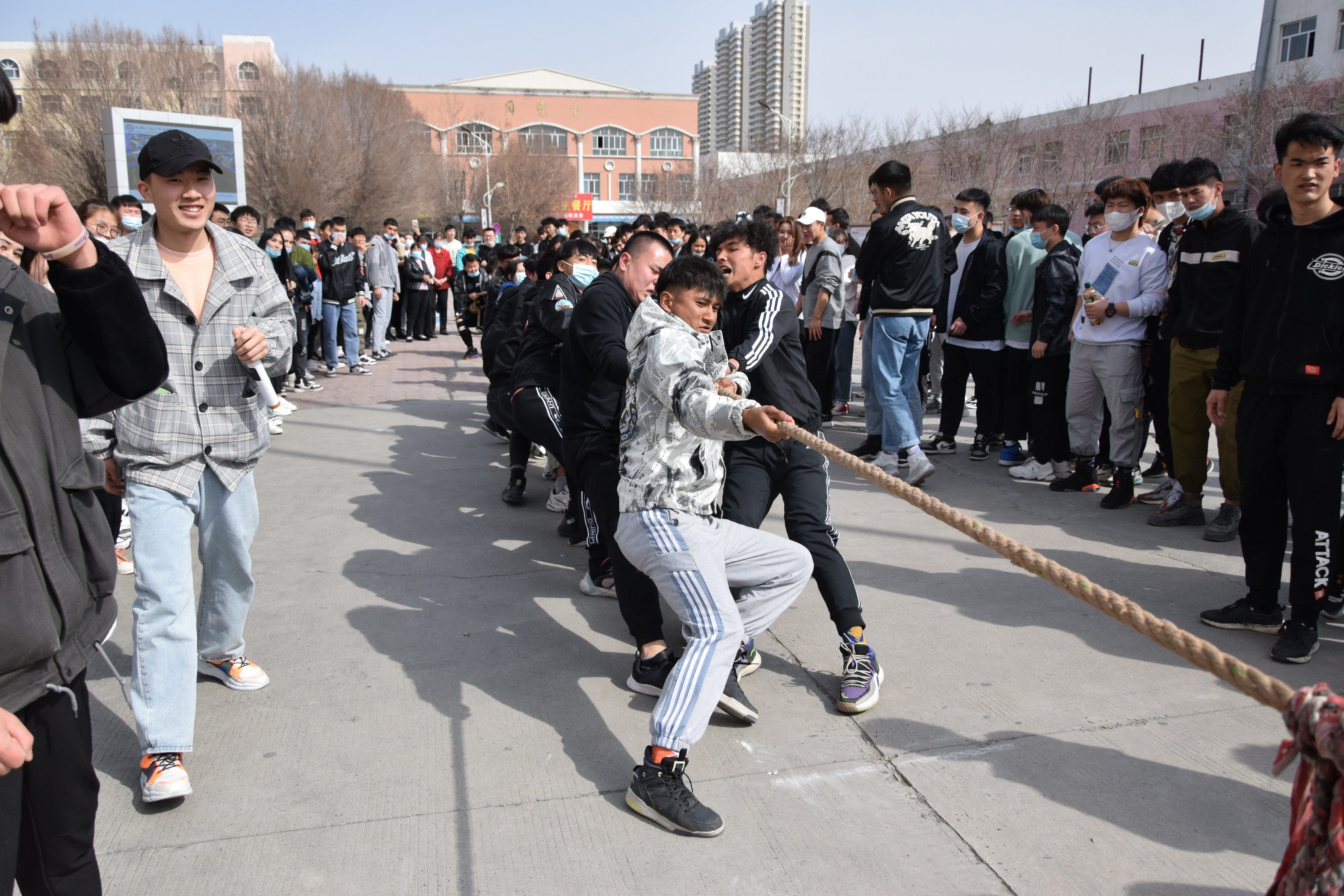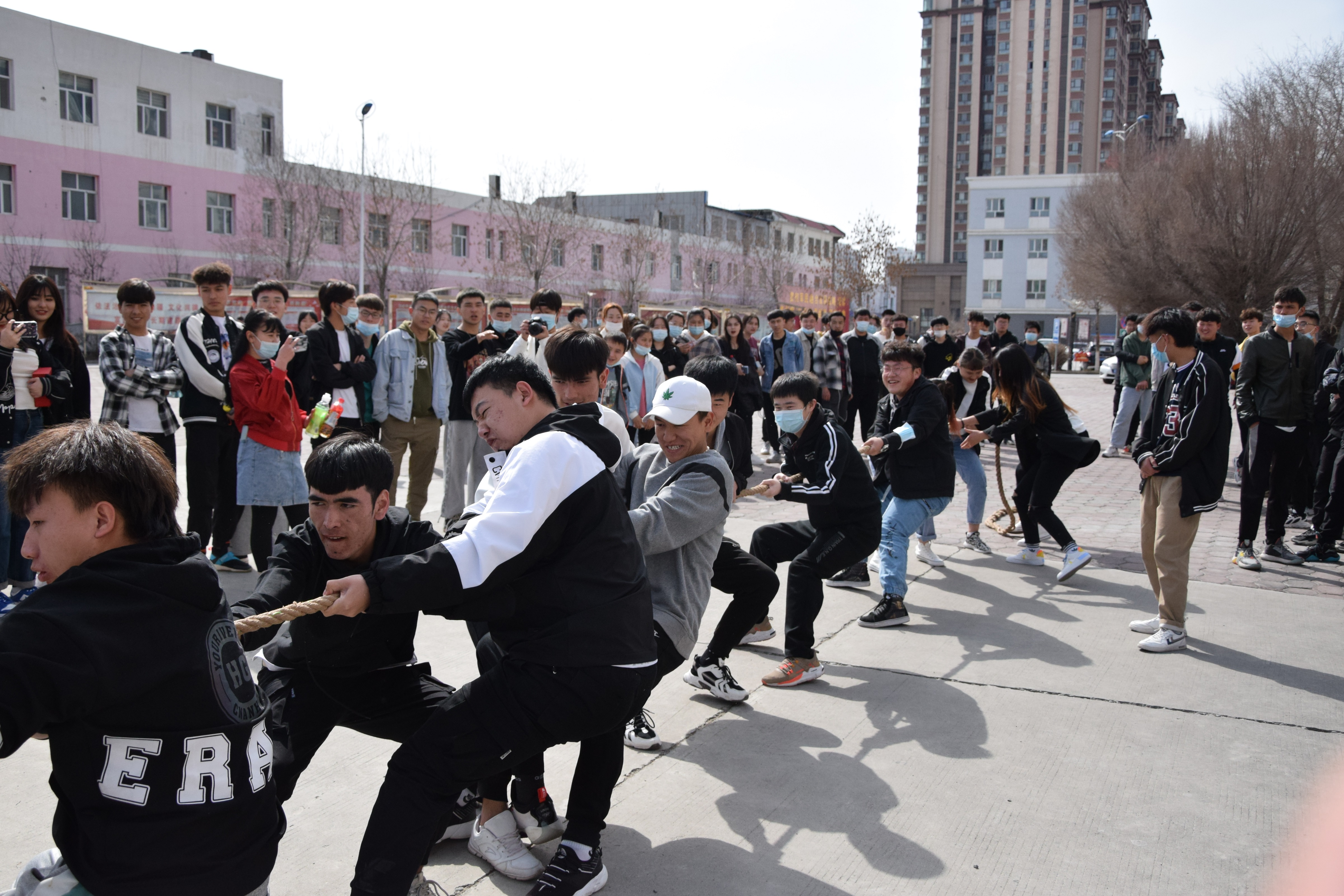 参赛队伍以班级为组别,共有15队、各班级代表队都显示出最强的比赛阵容,齐心协力,勇争第一,当比赛的哨声响起,只见参赛的队员们紧握长绳,卯足了劲拼命往后拉!各班班主任也在队伍旁边助阵!